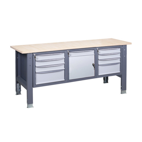 Наличие трех тумб позволяет размещать значительное количество инструментов и материалов, обеспечивая порядок и эффективную организацию рабочего места. Оцинкованные столешницы повышают устойчивость к механическим повреждениям, нержавеющая поверхность предотвращает коррозию, а резиновое покрытие обеспечивает лучшее удержание предметов на поверхности.