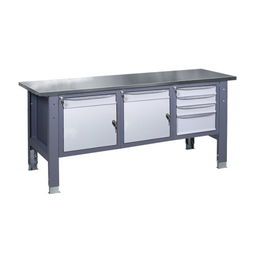 Наличие трех тумб позволяет размещать значительное количество инструментов и материалов, обеспечивая порядок и эффективную организацию рабочего места. Оцинкованные столешницы повышают устойчивость к механическим повреждениям, нержавеющая поверхность предотвращает коррозию, а резиновое покрытие обеспечивает лучшее удержание предметов на поверхности.