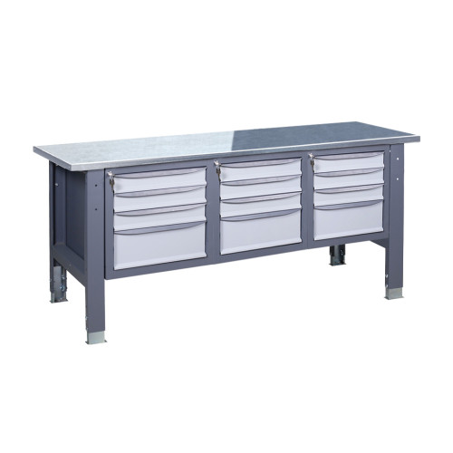 Наличие трех тумб позволяет размещать значительное количество инструментов и материалов, обеспечивая порядок и эффективную организацию рабочего места. Оцинкованные столешницы повышают устойчивость к механическим повреждениям, нержавеющая поверхность предотвращает коррозию, а резиновое покрытие обеспечивает лучшее удержание предметов на поверхности.