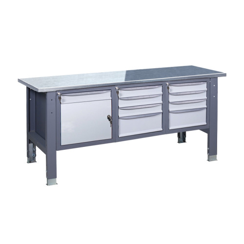 Наличие трех тумб позволяет размещать значительное количество инструментов и материалов, обеспечивая порядок и эффективную организацию рабочего места. Оцинкованные столешницы повышают устойчивость к механическим повреждениям, нержавеющая поверхность предотвращает коррозию, а резиновое покрытие обеспечивает лучшее удержание предметов на поверхности.