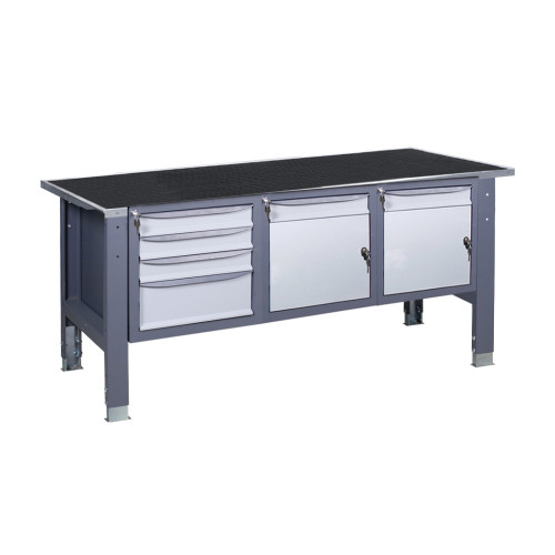 Наличие трех тумб позволяет размещать значительное количество инструментов и материалов, обеспечивая порядок и эффективную организацию рабочего места. Оцинкованные столешницы повышают устойчивость к механическим повреждениям, нержавеющая поверхность предотвращает коррозию, а резиновое покрытие обеспечивает лучшее удержание предметов на поверхности.