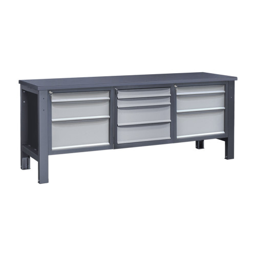 Верстак Важкої серії – це надійний робочий стіл для виконання інтенсивних навантажень у виробничих, ремонтних і слюсарних цехах. Каркас виготовлений із металу, який проходить попередню обробку методом фосфатування, що покращує адгезію фарби, та покривається порошковою фарбою для захисту від корозії та механічних пошкоджень. Конструкція забезпечує високу стійкість під час експлуатації, а дві тумби дозволяють організувати зручне зберігання інструментів і витратних матеріалів.