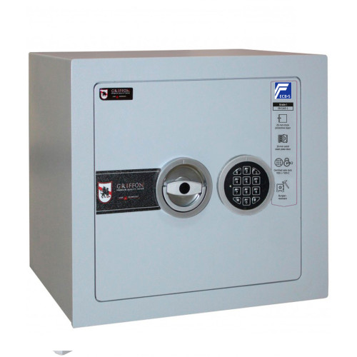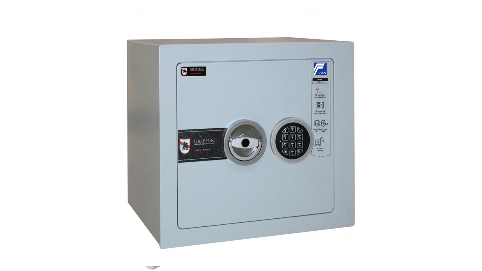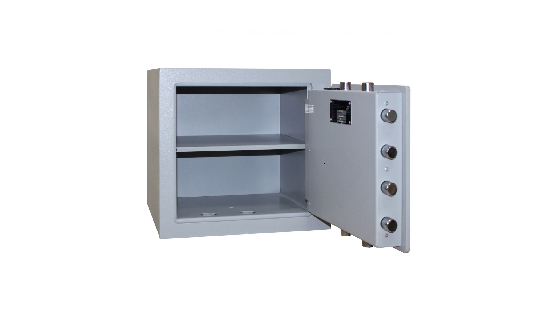 Модель соответствует I классу взломостойкости по стандарту EN 1143-1, что гарантирует защиту от механического воздействия. Корпус изготовлен из металла толщиной корпуса 25 мм, что повышает его стойкость к взлому. Система запирания реализована в виде ригельного механизма трехстороннего действия, включающего восемь хромированных активных ригелей диаметром 25 мм и антиспилы со стороны петель. Установлен электронный кодовый замок M-LOCKS (Нидерланды), сертифицированный по VDS 2, что гарантирует высокую надежность хранения.