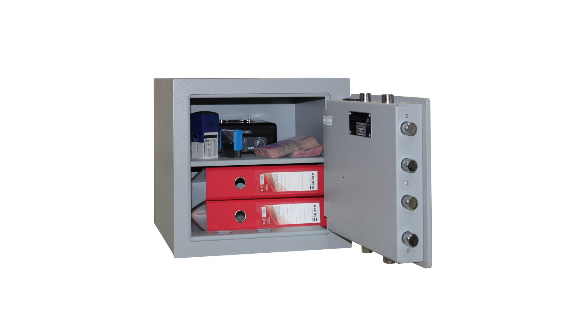 Габариты сейфа – 400×435×393 мм, внутренний объем – 40 литров. Вес – 89 кг, что затрудняет его несанкционированное перемещение. Внутри предусмотрена одна полка, позволяющая удобно организовать пространство. Цвет исполнения – серый (RAL 7040). Для надежной фиксации предусмотрены анкерные узлы для крепления сейфа к полу.
