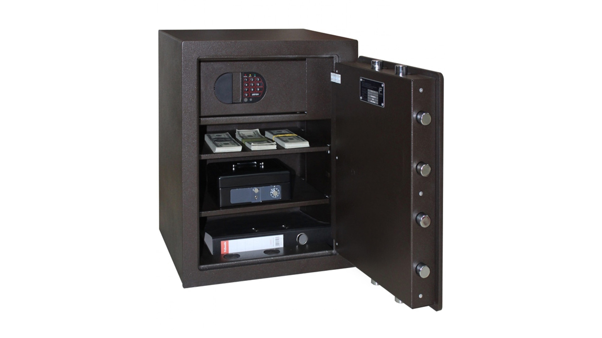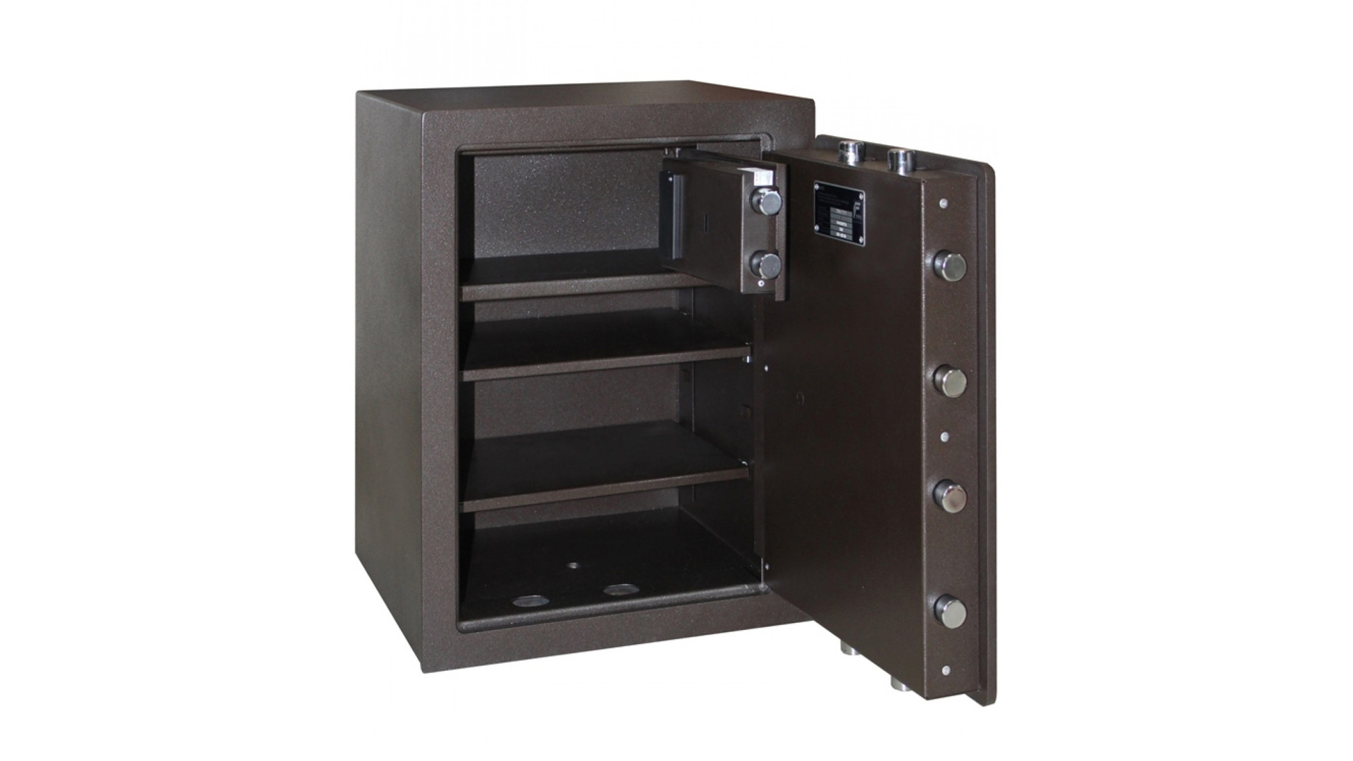 Запирание осуществляется с помощью электронного кодового замка STUV SWINGLOX (Германия) или M-LOCKS (Нидерланды), сертифицированного по VDS 2, что гарантирует надежное хранение содержимого. Габариты сейфа – 550×435×393 мм, внутренний объем – 57,75 литра. Вес – 122 кг, что затрудняет несанкционированное перемещение. Внутри предусмотрены две полки и трейзер, которые позволяют удобно организовать хранение документов и ценностей. Цвет исполнения – коричневый, что делает сейф эстетичным и позволяет интегрировать его в различные интерьеры.