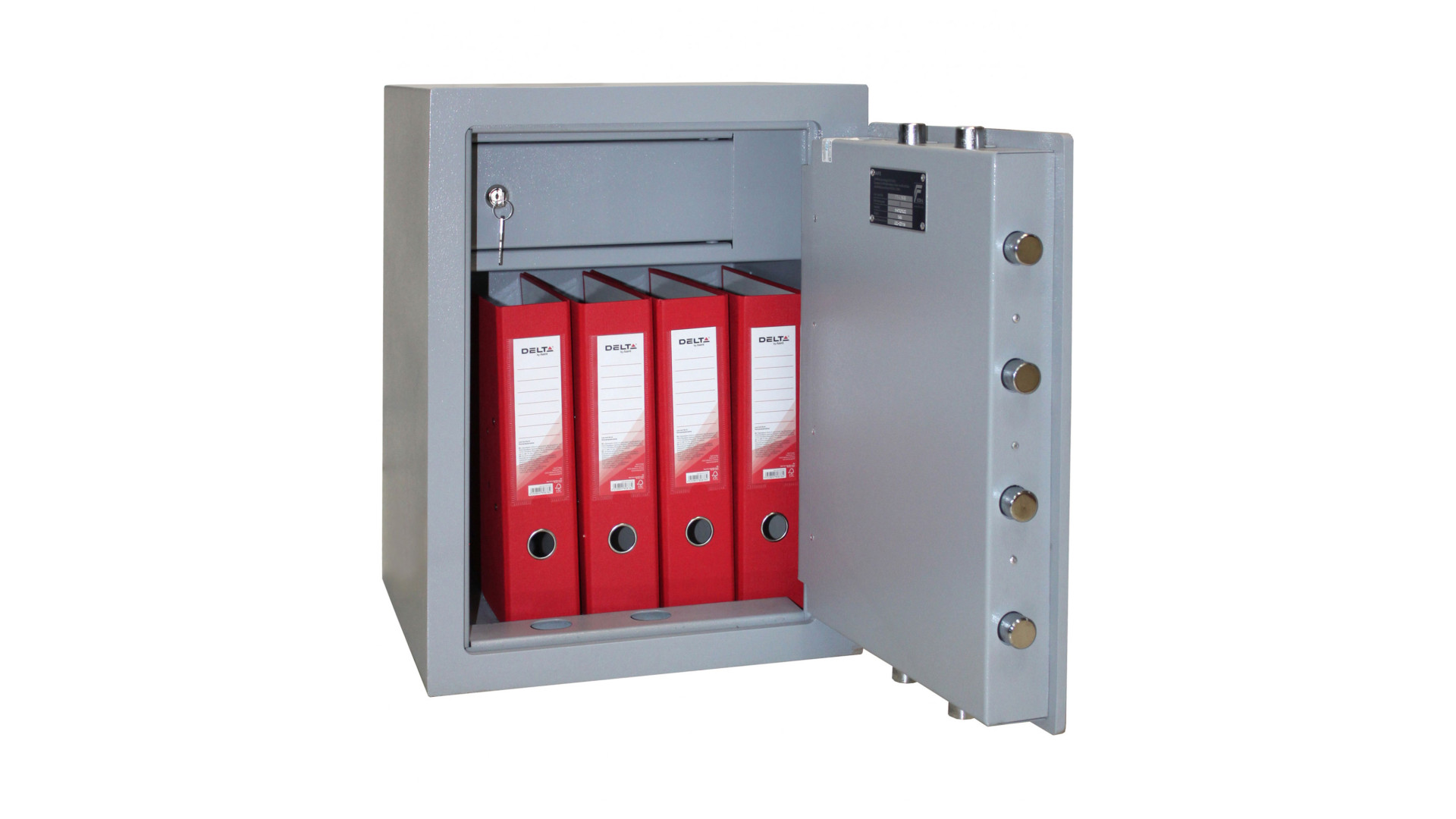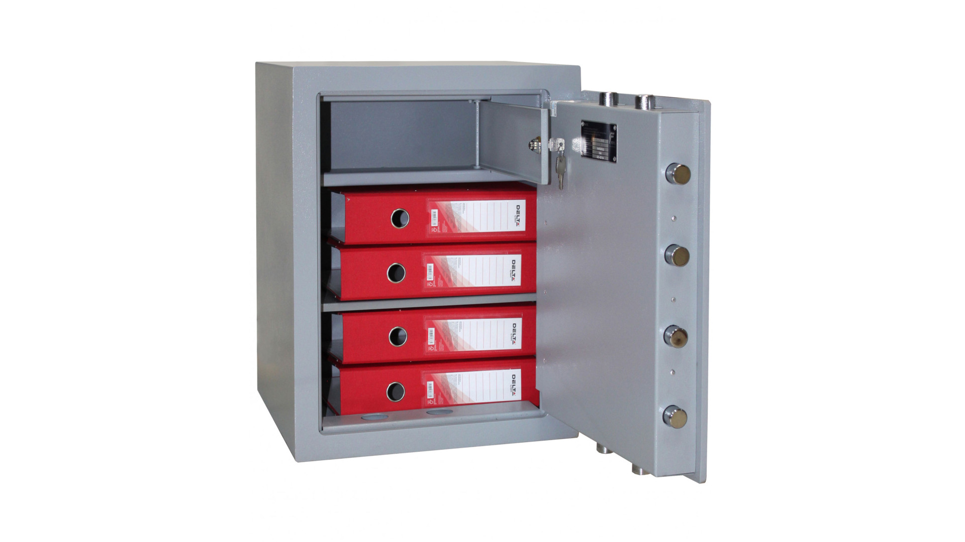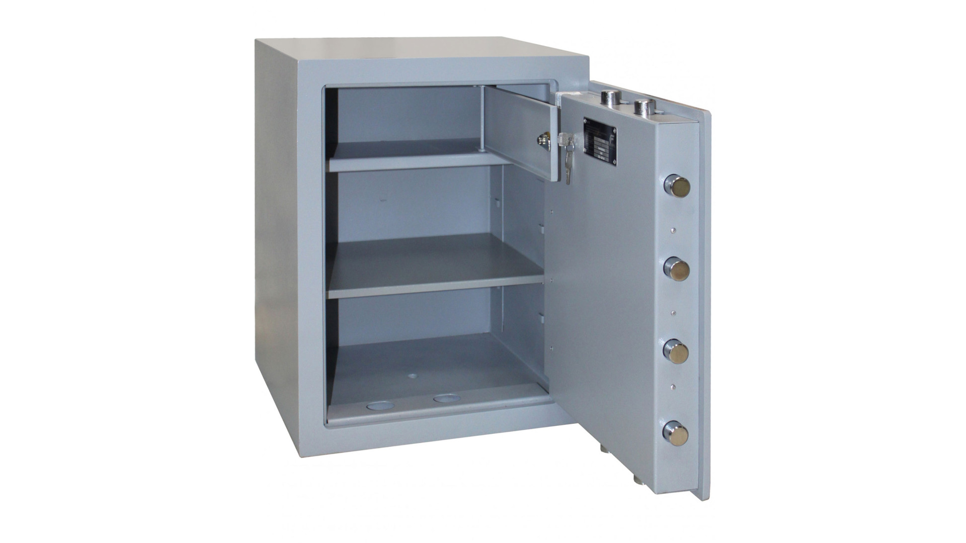 Сейф соответствует I классу взломостойкости по стандарту EN 1143-1, что гарантирует защиту от попыток несанкционированного доступа. Толщина стенок составляет 25 мм, что повышает уровень безопасности. Система запирания состоит из ригельного механизма трехстороннего действия, включающего восемь хромированных активных ригелей диаметром 25 мм. Антисрезы со стороны петель обеспечивают дополнительную защиту двери. Запирание осуществляется с помощью ключевого сейфового замка STUV (Германия), сертифицированного по VDS 1, что гарантирует надежную эксплуатацию.