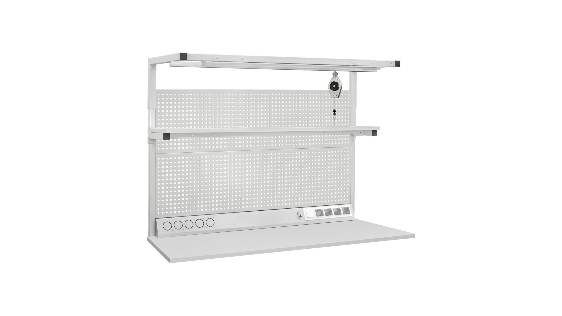 Перфорована панель дає можливість встановлювати навісне обладнання, а полиці створюють додатковий простір для зберігання інструментів. Комплект освітлення покращує видимість робочої зони, а електромонтажний блок спрощує підключення обладнання.
