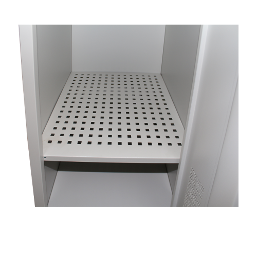 Перфоровані полки відрізняються від звичайних моделей тим, що вони мають безліч наскрізних отворів по периметру. Така конструкція спрощує повітрообмін всередині шафки, завдяки чому повітря не застоюється. Це також позбавляє від появи конденсату на одязі, що актуально в приміщеннях з підвищеним рівнем вологості. Крім того, такі полиці можуть використовуватися для зберігання взуття внизу шафки, щоб бруд і вода стікали вниз через отвори.