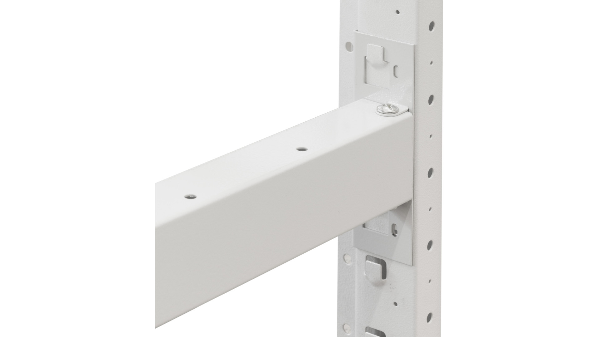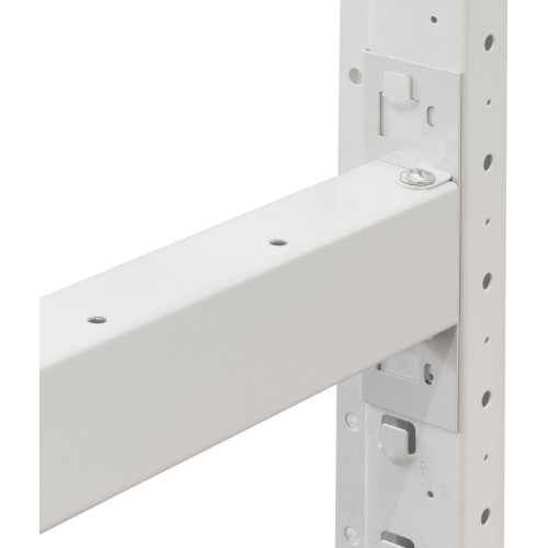 Завдяки продуманій системі кріплень на зачепах, монтаж горизонтальних перекладин до перфорованих стійок здійснюється швидко і без використання спеціалізованого інструменту. Це дозволяє оперативно змінювати висоту ярусів із кроком 50 мм, адаптуючи стелаж під нові потреби. Усі металеві елементи проходять фосфатування та вкриваються стійкою порошковою фарбою для захисту від корозії, вологи та перепадів температур.