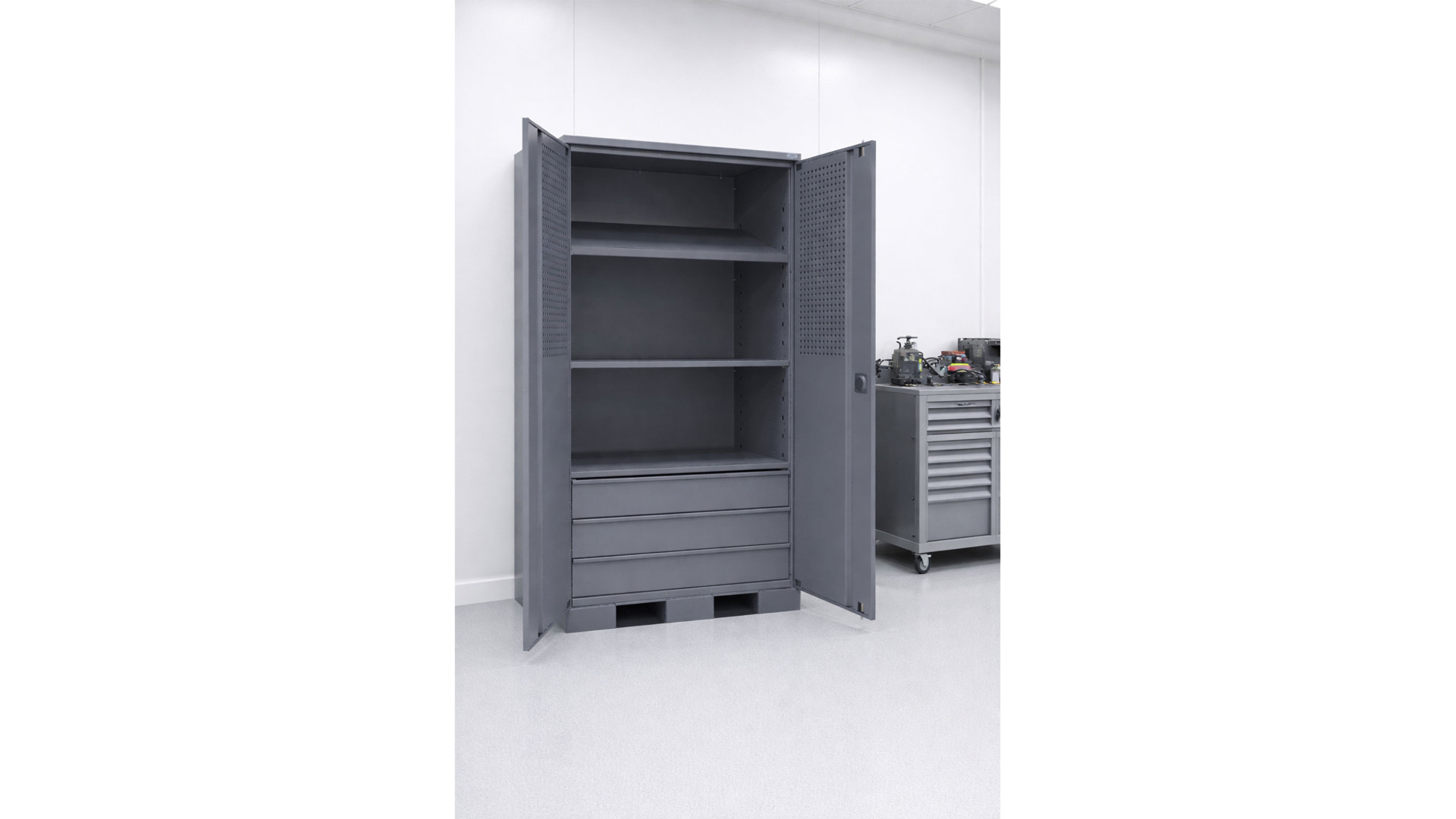 Важливою характеристикою шафи є можливість встановлення полиць під нахилом, що сприяє кращій організації робочого місця та зручності доступу до інструментів. Днище шафи має піддон з цинкованого металу з полімерним покриттям, що дозволяє переміщати її за допомогою рокли без ризику пошкодження. Замок з поворотною ручкою та ригельною системою забезпечує надійний захист обладнання від несанкціонованого доступу. Перфорована вставка у дверцятах не тільки додає естетичного вигляду, але й полегшує кріплення додаткової комплектації.