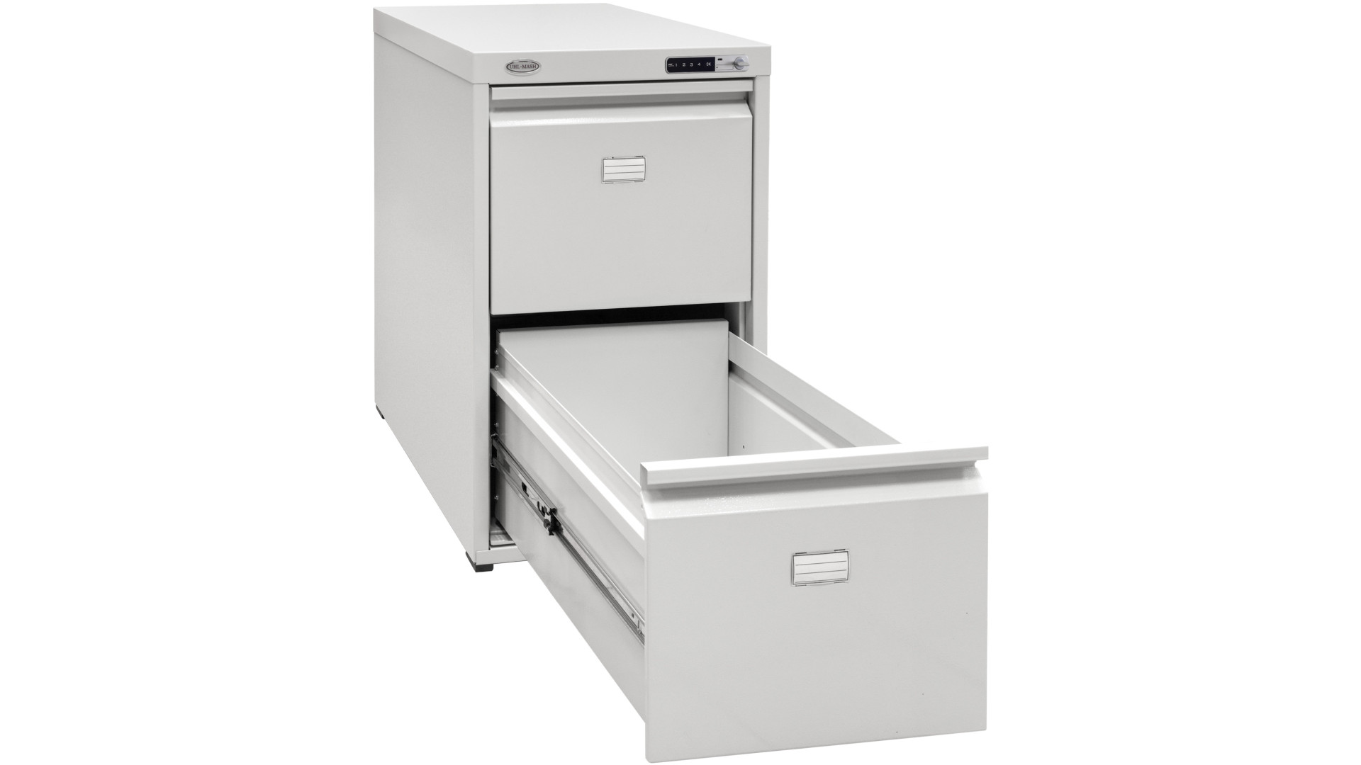 Модель складається з двох висувних ящиків. Електронний замок забезпечує надійне замикання та спрощує доступу для персоналу. Механізм телескопічних направляючих гарантує плавне та повне висування ящиків для зручної роботи з документами. Система антиперекидання блокує відкриття другого відділення, якщо перше вже відкрите. Це технічне рішення запобігає падінню конструкції під вагою документів. Пластикові ідентифікатори на фасадах допомагають швидко орієнтуватися в архівах.