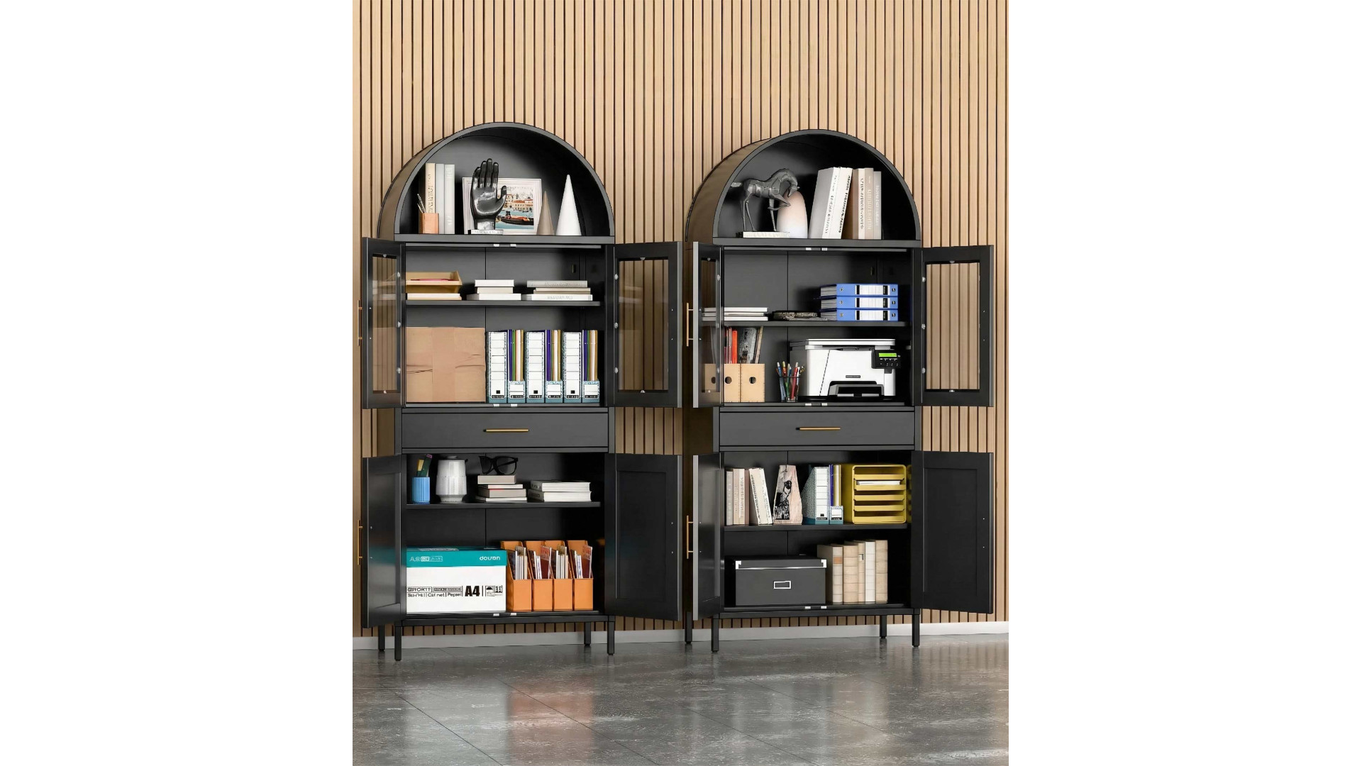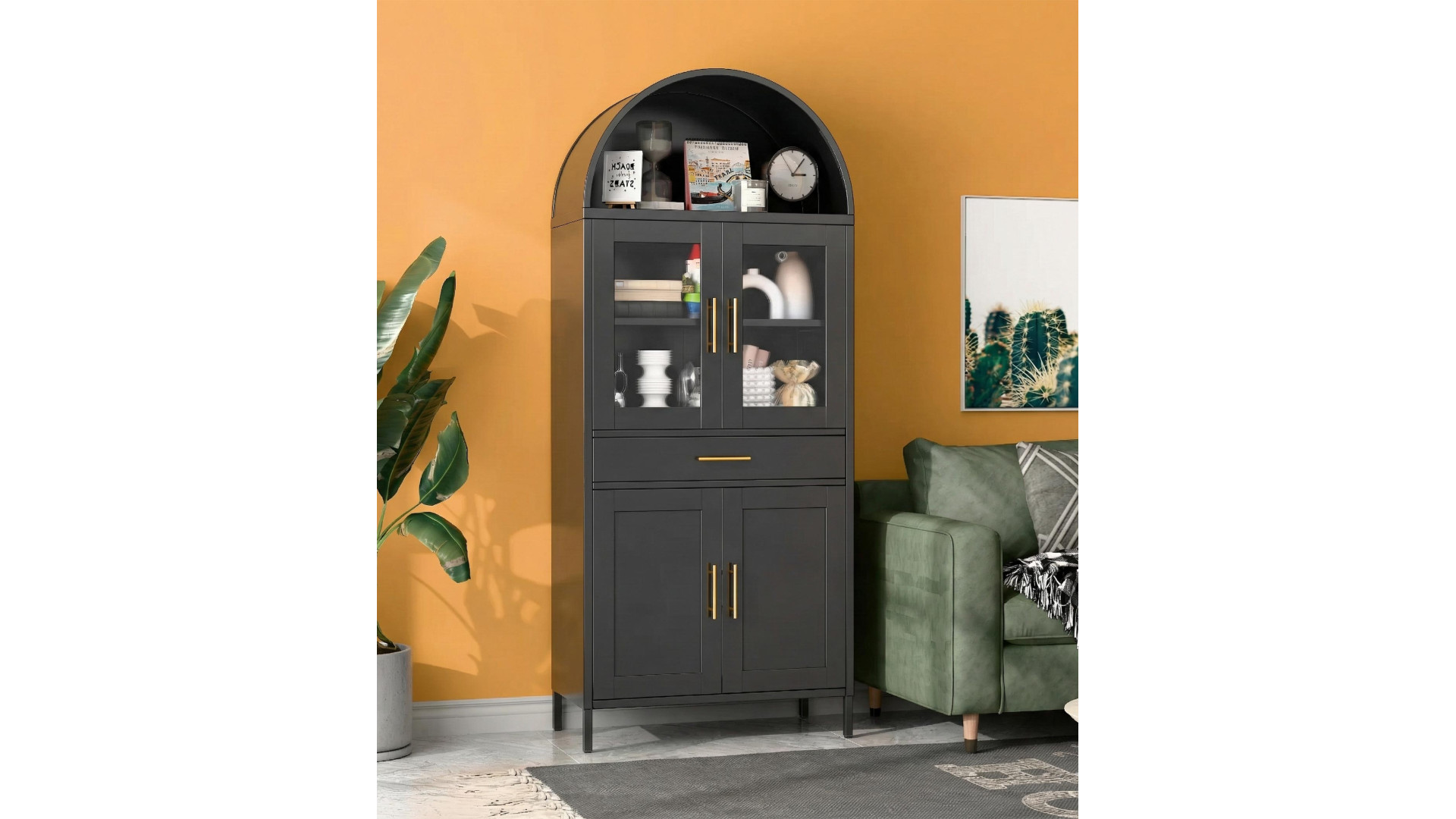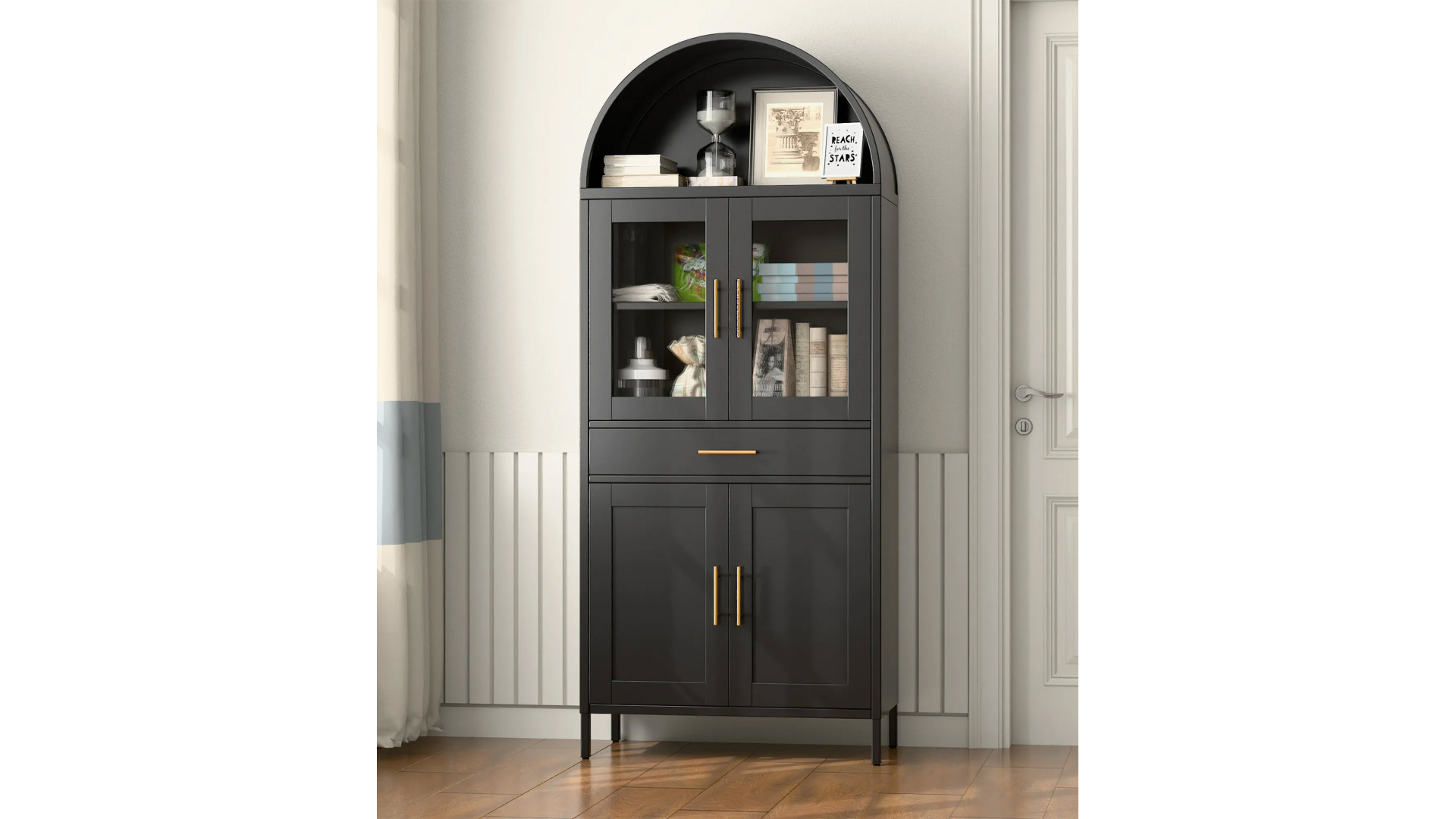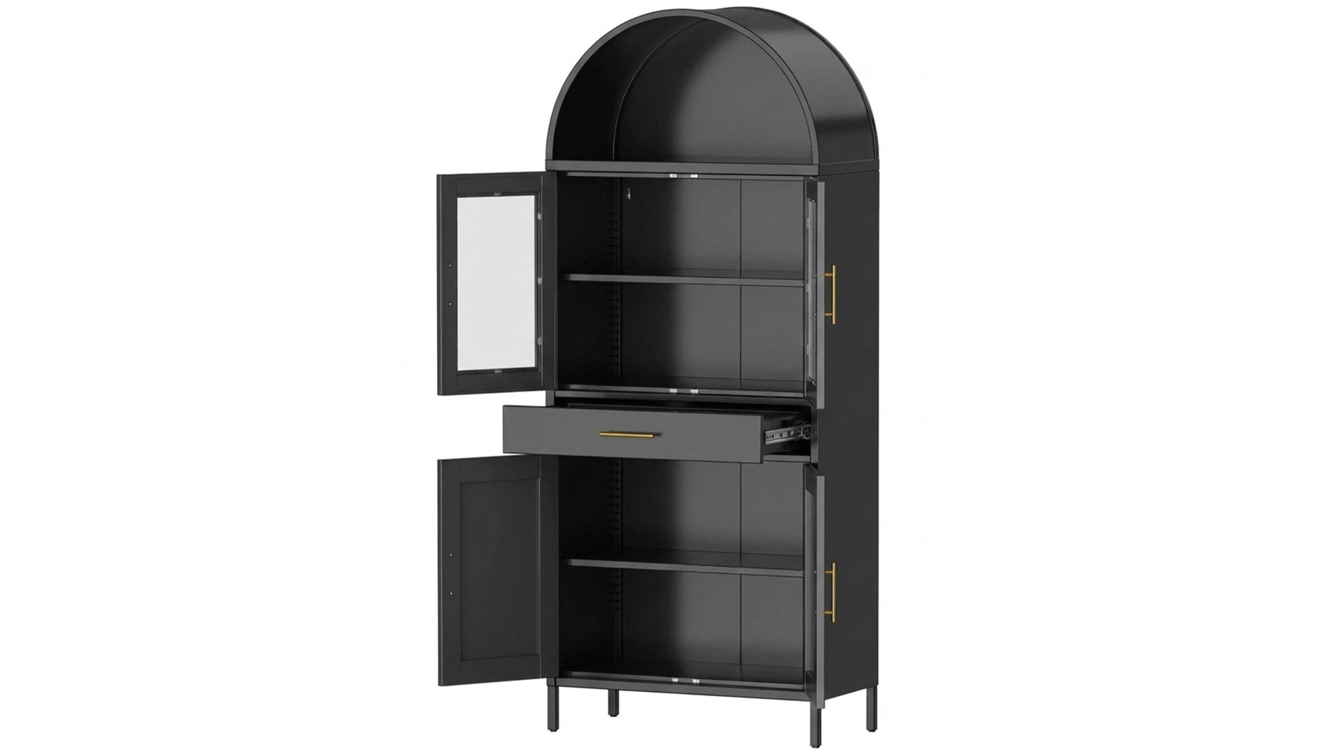 Шафа-вітрина металева «Арка», модель 08 – це багатофункціональна система зберігання, що поєднує в собі переваги вітрини та закритої шафи. Виріб виготовлено з високоякісної сталі товщиною 0,6-0,8 мм, що забезпечує високу стійкість до деформацій. Металевий корпус є пожежобезпечним, не містить шкідливих смол, стійкий до перепадів температур і підвищеної вологості. Поверхня захищена полімерним порошковим покриттям чорного кольору (RAL 9005), яке запобігає корозії та зберігає естетичний вигляд шафи.