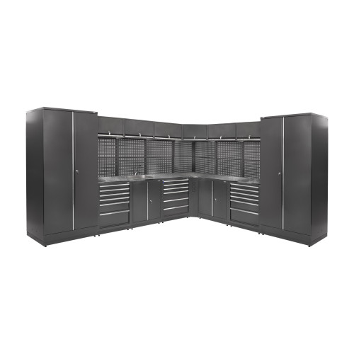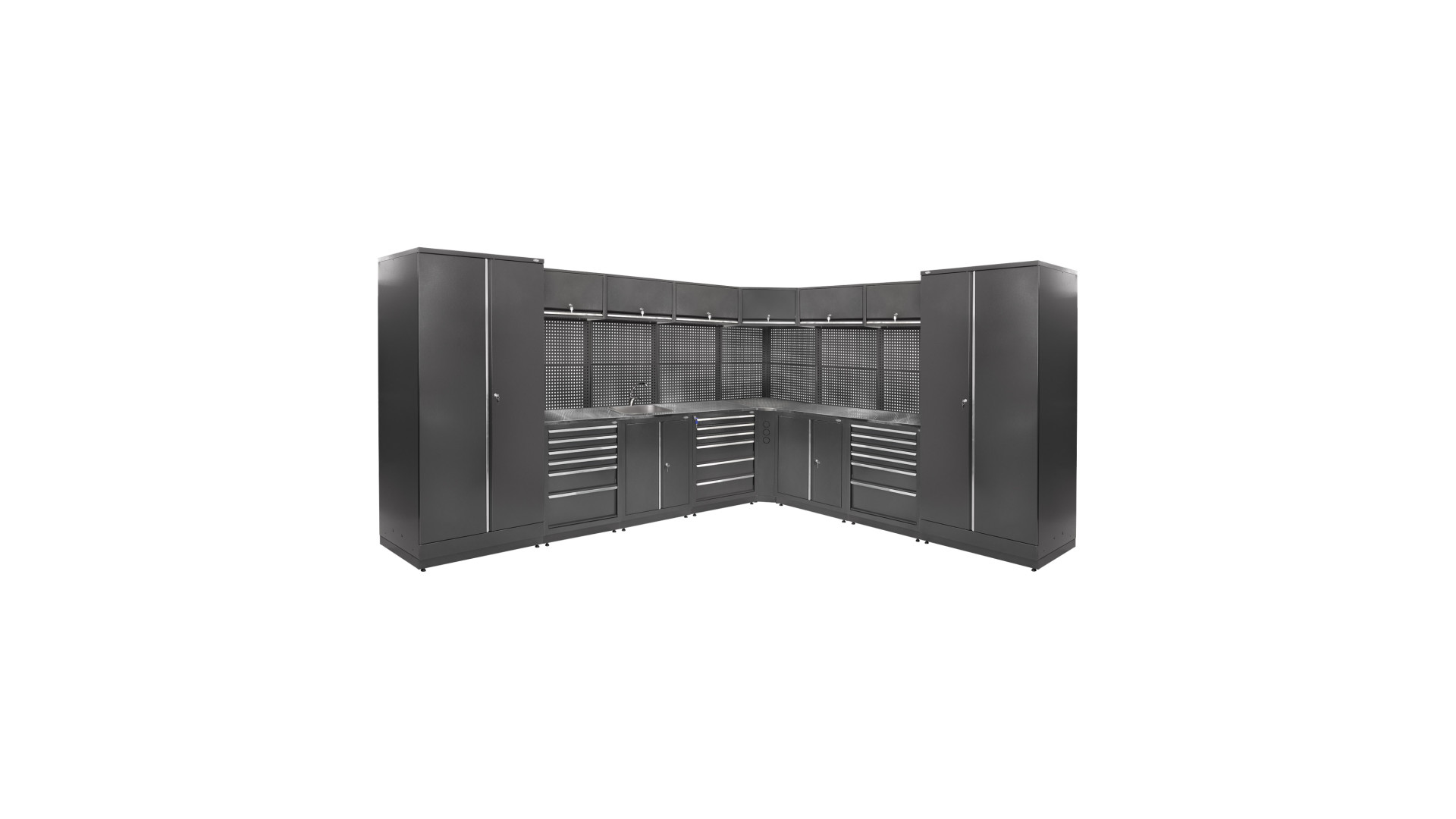 Модель виготовлена зі сталі з порошковим покриттям RAL7016 (антрацитово-сірий), яке захищає від корозії та зносу. Габарити становлять 3725×3050×2020 мм, вага залежно від комплектації – від 668 до 687 кг. У складі передбачені шафи MODUL 1000-4П та MODUL 1000 ОГ, блоки MODUL 3М3С, 4МСБ, Д і кутовий модуль. Робочу поверхню утворюють дві стільниці, які формують велику площину для виконання завдань.