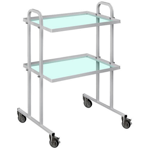 Модель має розбірний металевий каркас зі сталевої профільної труби 20×20 мм. Для розміщення інструментів передбачено дві скляні полиці товщиною 4 мм. Вертикальні стійки з рамками-полицетримачами підвищують жорсткість конструкції та забезпечують надійну фіксацію полиць. Стіл обладнаний чотирма самопозиційними колесами діаметром 100 мм, два з яких мають гальма для фіксації під час роботи. Виступаючі частини стійок виконують функцію ручок, що полегшує транспортування. Поверхня пофарбована білою порошковою фарбою RAL з антибактеріальними властивостями, стійкою до дії дезінфекційних засобів.