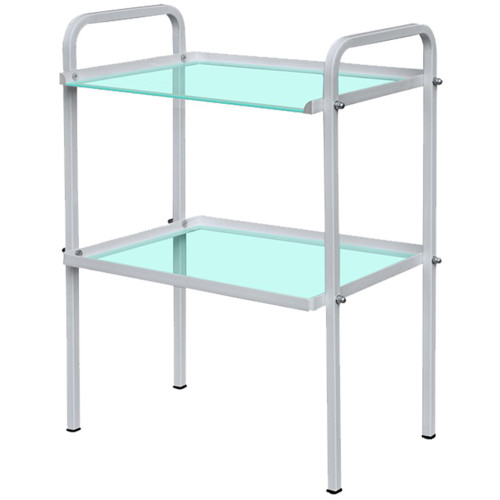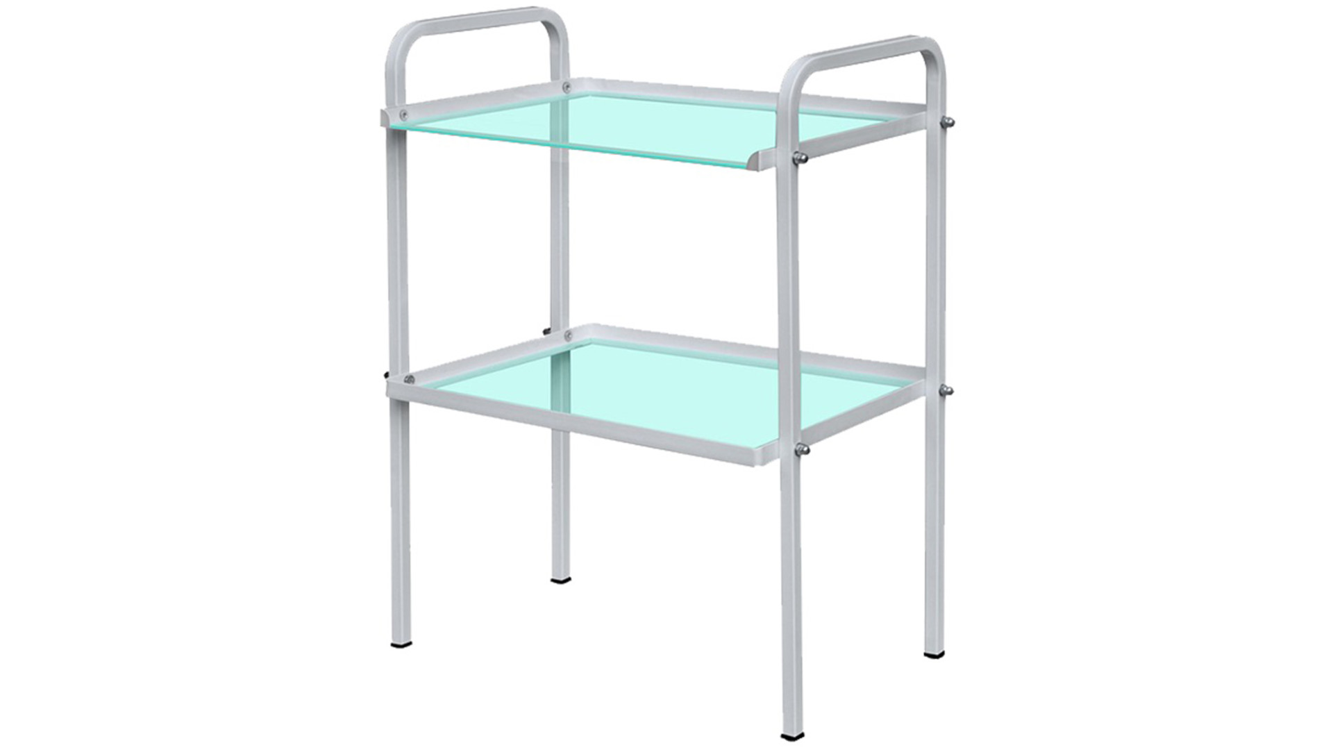 Модель має металевий каркас із двома скляними полицями, які дозволяють розміщувати інструменти та матеріали на різних рівнях. Верхня полиця без переднього бортика зручна для замішування препаратів і роботи з матеріалами. Стіл встановлений на гумові опори, що підвищують стійкість конструкції та запобігають ковзанню під час експлуатації. За потреби можливе виготовлення модифікації на колесах для зручного переміщення в межах кабінету. Поверхня пофарбована порошковою фарбою білого кольору RAL з антибактеріальними властивостями, стійкою до дії дезінфекційних засобів.