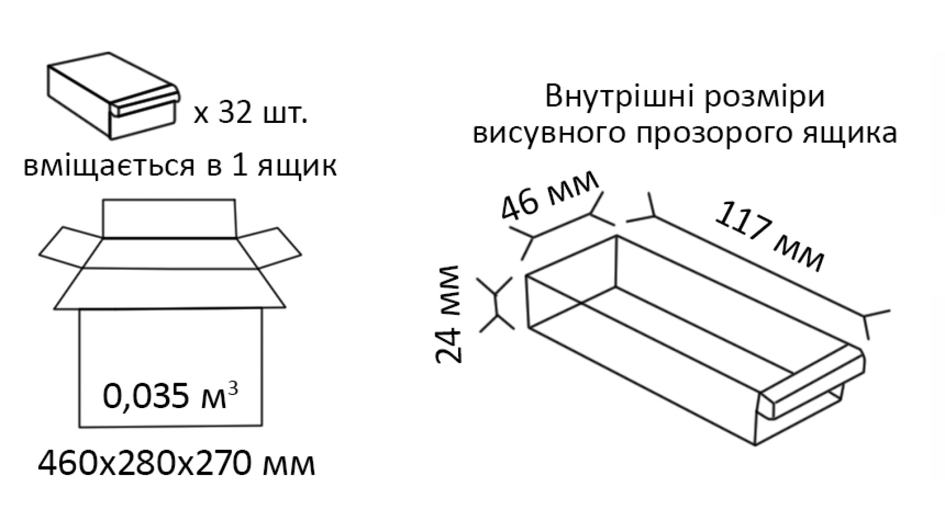 Габарити ящика (В×Ш×Г): 58×110×122 мм. Корпус виготовлений з високоякісного полімеру, що забезпечує міцність і стійкість до навантажень. Шухляда виконана з прозорого пластику, що дозволяє візуально контролювати її наповнення. Робочий температурний діапазон становить від -20 до +60 °С, що дозволяє експлуатувати ящик у різних умовах. Об’єм шухляди – 0,13 літра, що оптимально для зберігання дрібних компонентів, які необхідно тримати під рукою.