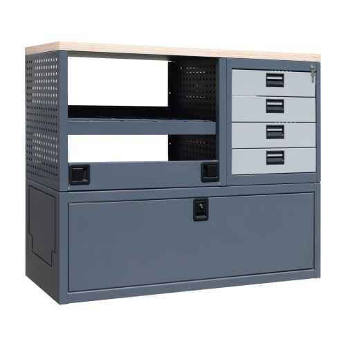 Автомобільний модуль 12/4-Т/П/2М2С та 12/4-Т/П/4М призначений для організації простору в пересувних майстернях і мобільних СТО. Каркас конструкції виготовлений із міцного сталевого профілю, який гарантує необхідну міцність і стабільність. Це дає змогу надійно закріпити інструмент і обладнання під час руху автомобіля, виключаючи ризик його падіння або пошкодження.