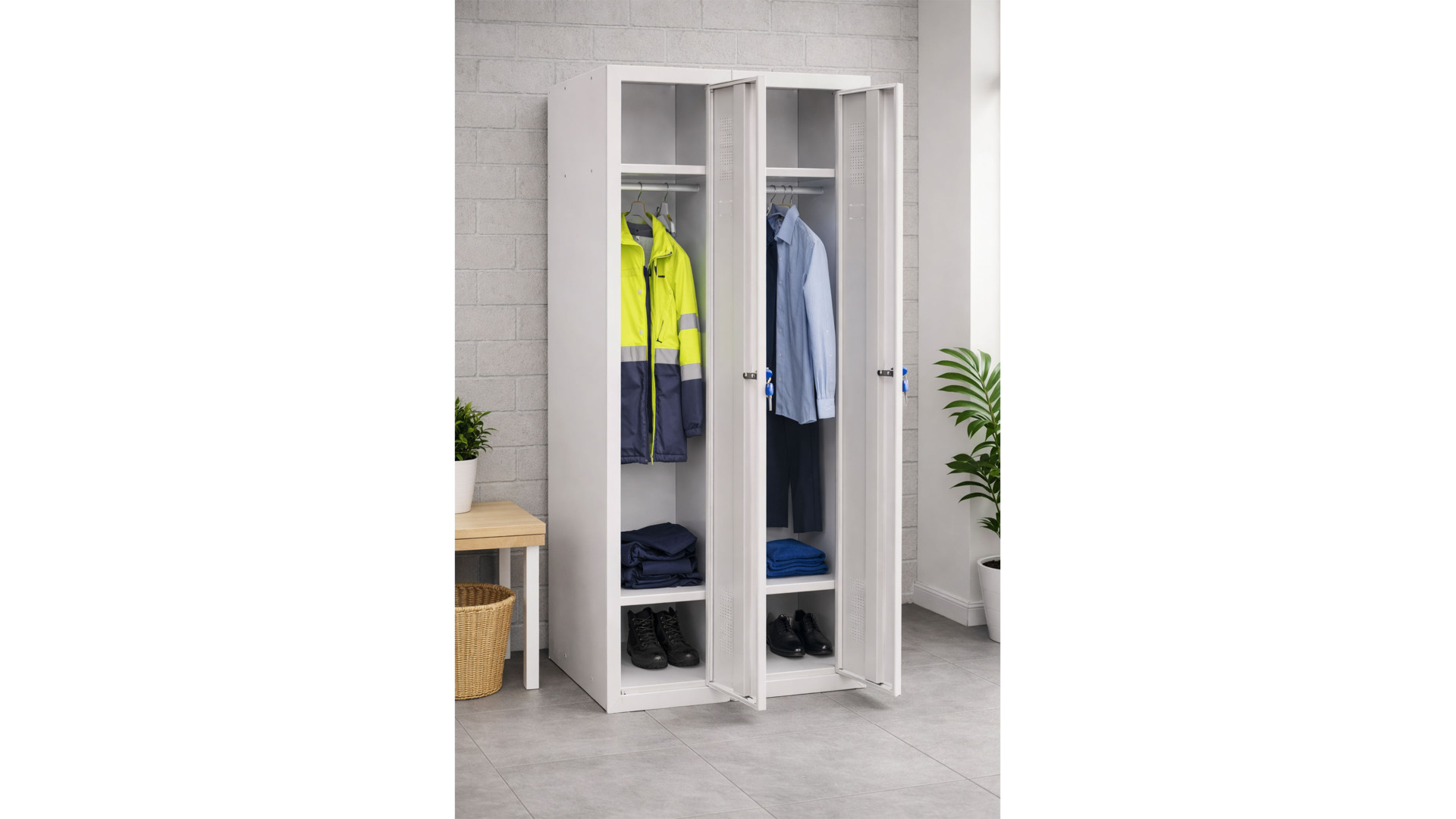 Менеджер допоможе підібрати оптимальний тип збірки при оформленні замовлення. Комірки обладнані скобою під вішалки. Це допоможе комфортно зберігати верхній одяг. Поличка і гачок дозволять компактно розмістити особисті речі в шафці. Перфоровані двері одягової шафи ШОМ-300/2 вик.06 забезпечують вентилювання вмісту. Це перешкоджає скупченню неприємних запахів і вологи всередині шафки. Конструкція забарвлюється полімерно-порошковою фарбою світло-сірого кольору. Фосфатування корпусу захищає шафу від корозії. Фарба не містить токсичних компонентів. Шафи можна встановлювати у вологих закритих просторах, що робить їх універсальними. Купуйте шафи для одягу ШОМ-300/2 вик.06 за цінами виробника.