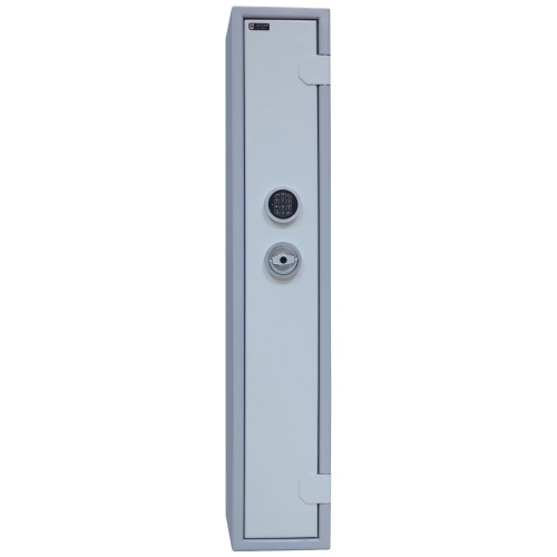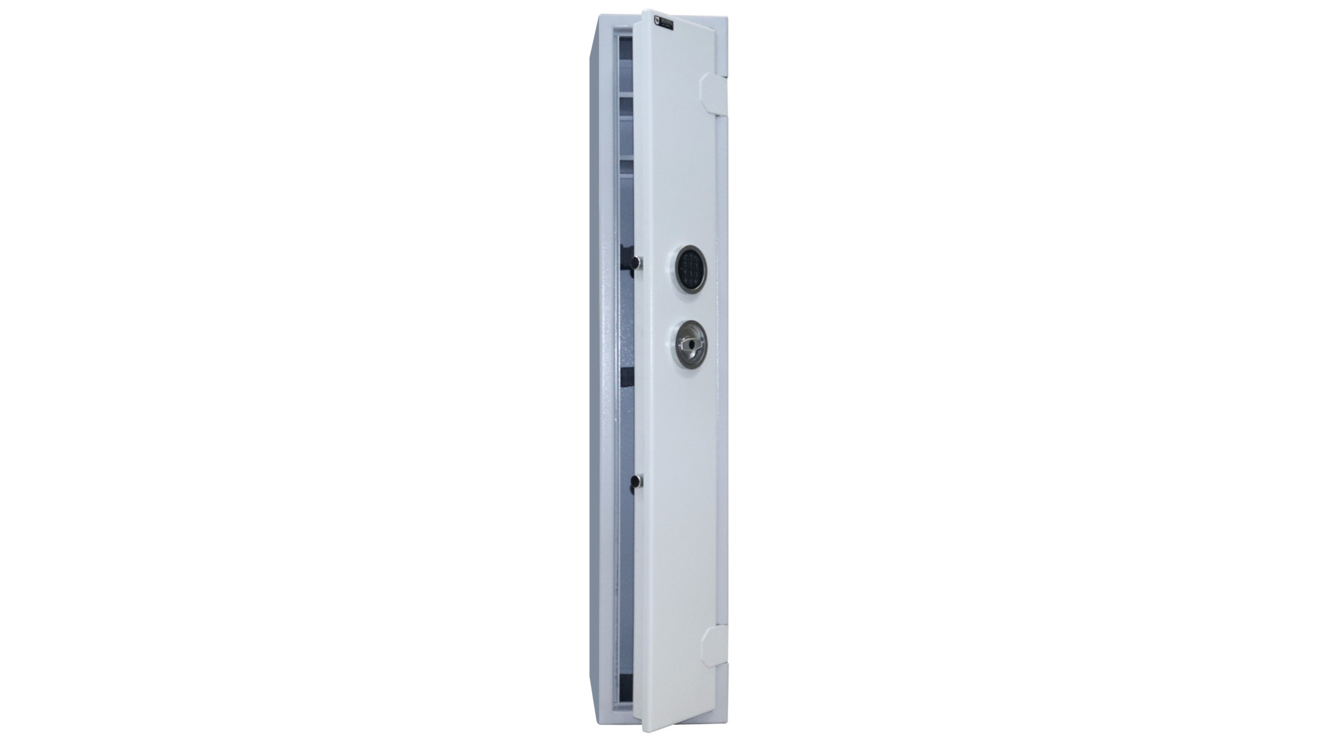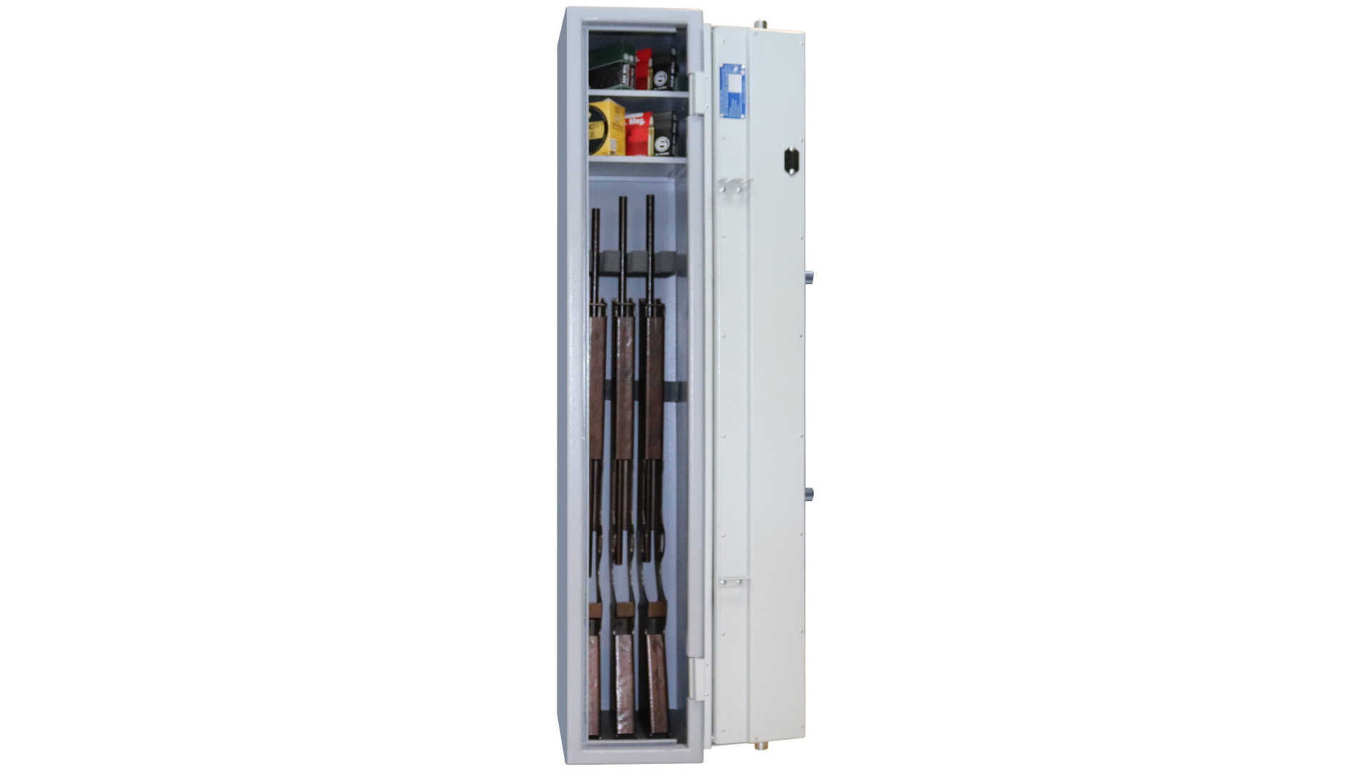 Система замикання представлена електронним кодовим замком M-LOCKS (Нідерланди) або SMARTLOCK (Італія), який відповідає класу VDS 2. Це дає змогу власнику змінювати код доступу та контролювати безпеку зберігання. Внутрішній простір передбачає 2 полиці, що дозволяє зручно розміщувати патрони, документи та аксесуари. Габарити сейфа – 1400×250×300 мм, а об’єм становить 76,5 літра.