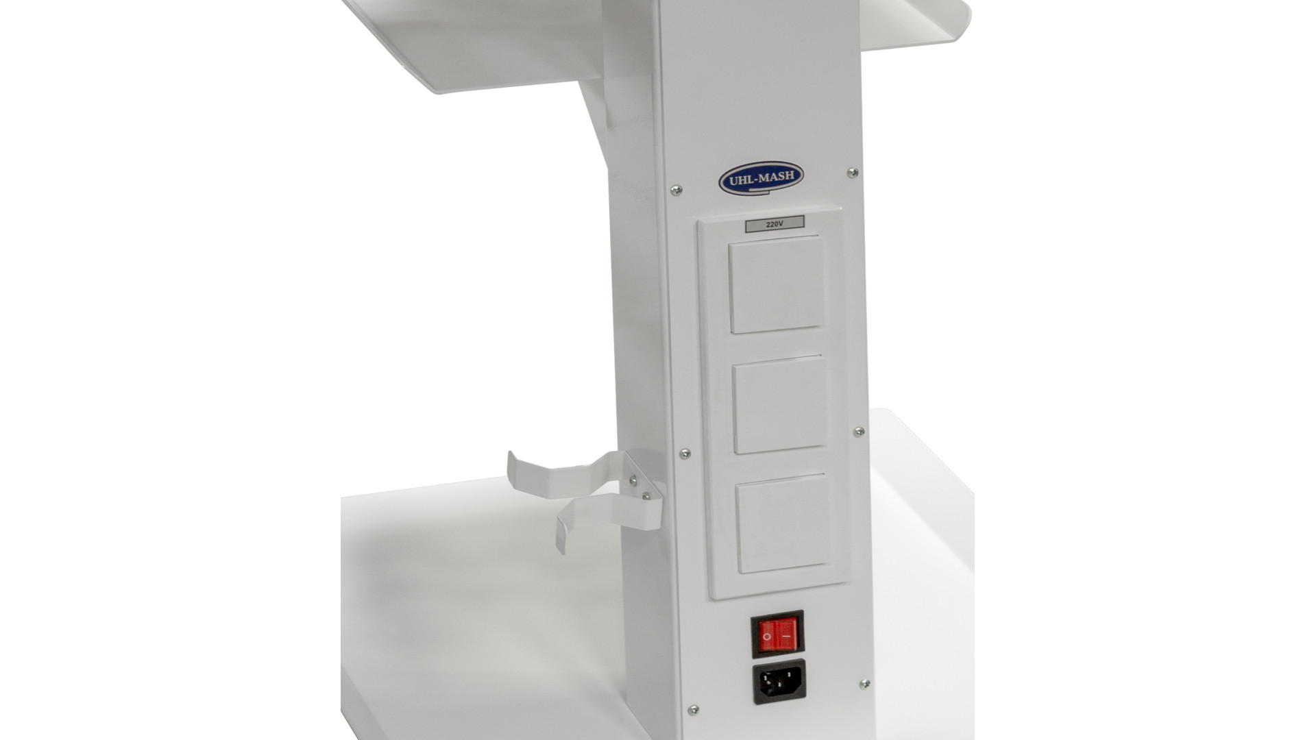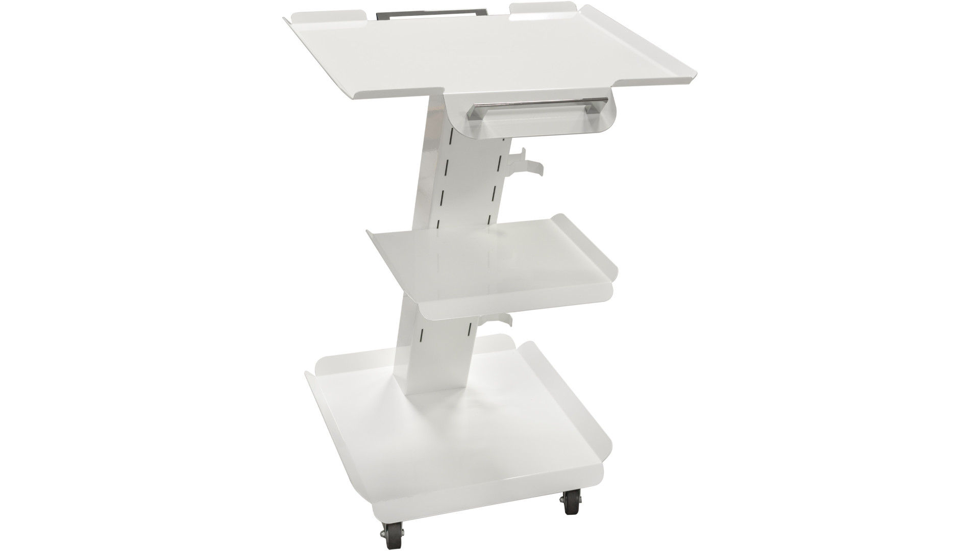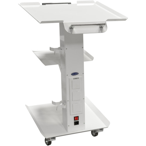 Стійка використовується у медичних кабінетах, лабораторіях, сервісних зонах та інших робочих приміщеннях. Вона забезпечує зручне розміщення приладів завдяки триярусній конструкції. Виріб обладнаний коліщатками для переміщення між робочими зонами. У центральній частині розташовані монтажні місця для встановлення електричних розеток і вимикача, що спрощує підключення обладнання. Виріб підтримує мобільність при збереженні стійкості, а компактні габарити дають змогу працювати у вузьких зонах.