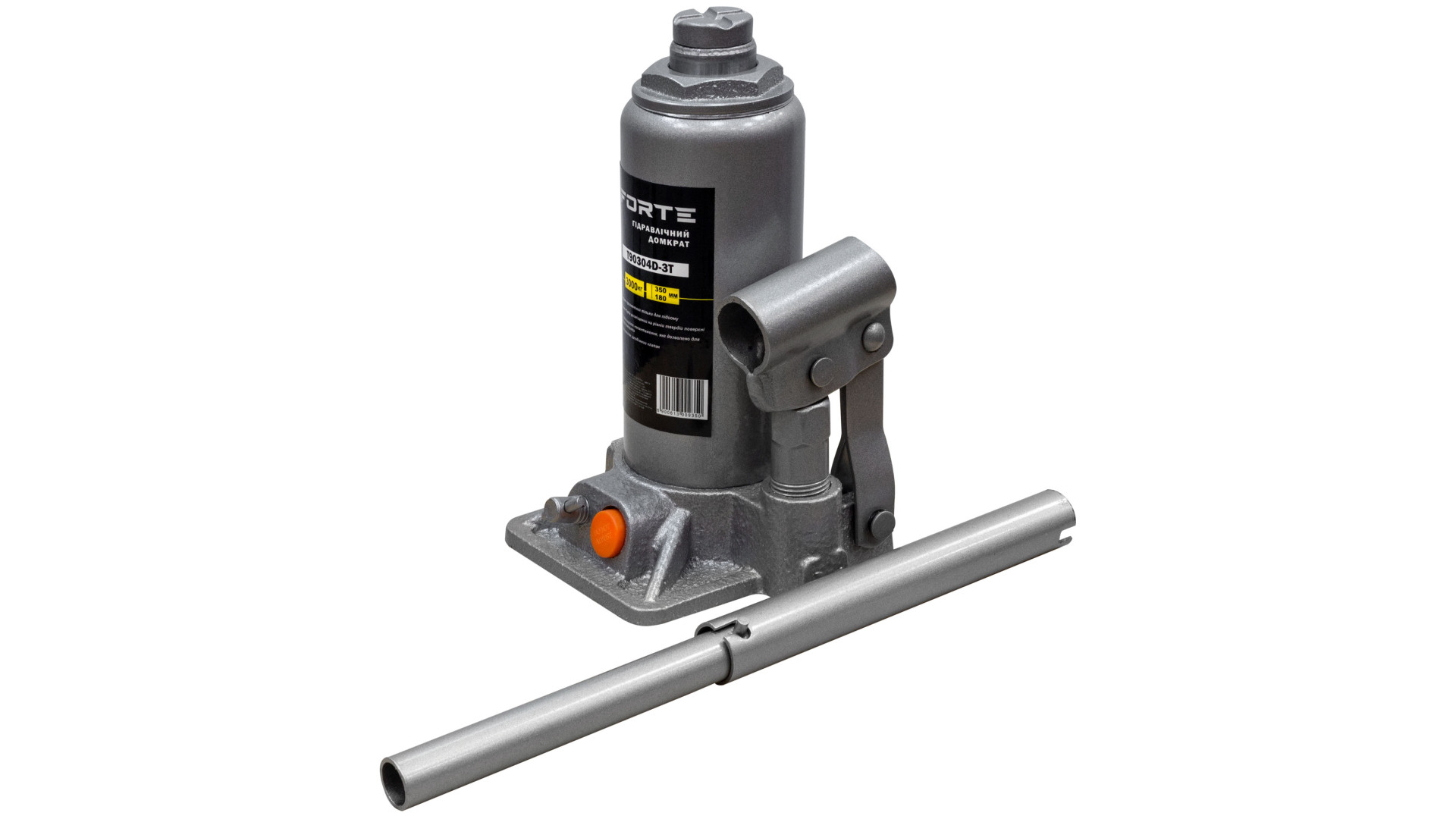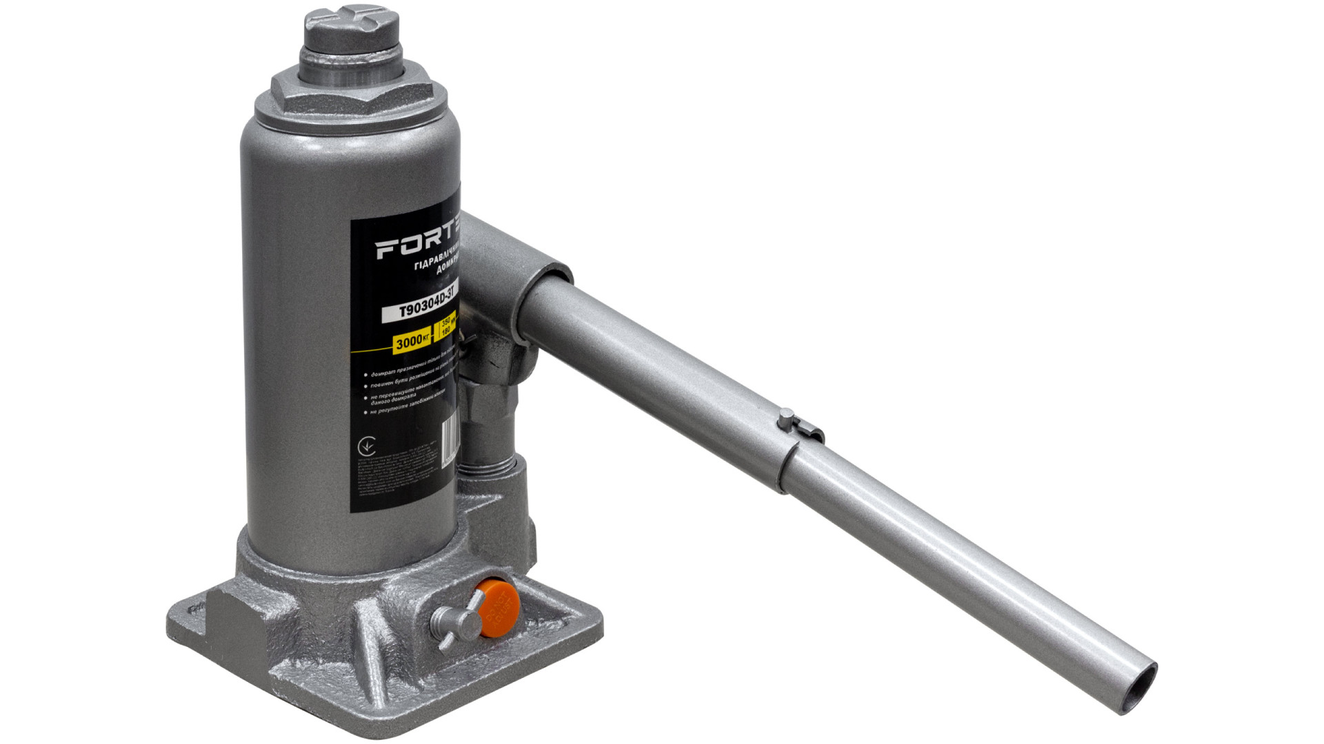Домкрат пляшковий T90304D-3T – це професійний інструмент для підйому автомобілів, який забезпечує зручність під час виконання ремонтних або обслуговувальних робіт. Модель має вантажопідйомність 3000 кг, що дозволяє працювати з більшістю легкових автомобілів і малотоннажних транспортних засобів. Висота підхвату становить 180 мм, а висота підйому досягає 350 мм, що забезпечує достатній діапазон для різних завдань.