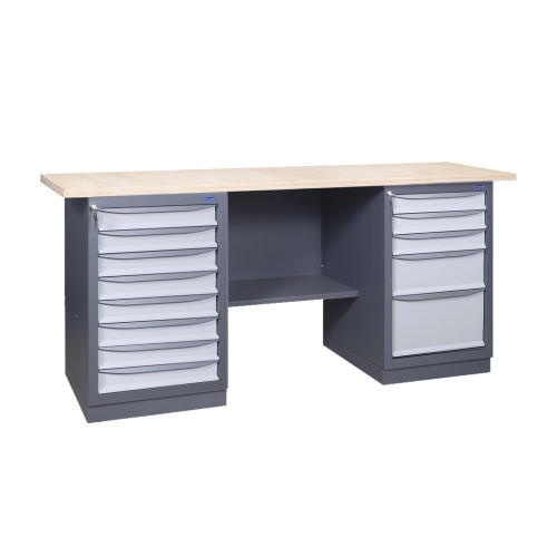 Верстаки серії ПРОФІ – це професійні робочі столи, які застосовуються для виконання різних виробничих і ремонтних робіт у майстернях, слюсарних та виробничих цехах. Каркас виготовлений із металу, що проходить попередню обробку та покривається порошковою фарбою для захисту від корозії та механічних пошкоджень. Конструкція передбачає наявність двох тумб, що дозволяє зберігати інструменти, витратні матеріали та інше необхідне оснащення. Верстаки цієї серії забезпечують високу стійкість під час роботи та можуть комплектуватися різними видами стільниць відповідно до потреб користувача.
