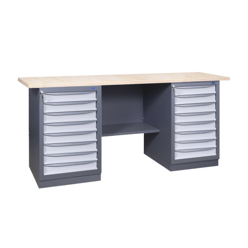 Металевий слюсарний Верстак 41 8М/8М Верстаки з двома тумбами призначені для обладнання робочих місць на промислових підприємствах, в майстернях і автосервісах. Верстаки виготовляються з високоякісної листової сталі. Верстаки двотумбові можуть укомплектовуватися перфорованими панелями, підвісними полками, лампами денного освітлення, блоком розеток, тримачами для інструменту і гачками. Верстаки з двома тумбами можуть поставлятися в розібраному вигляді. Тумби верстаків можуть укомплектовуватися різною кількістю ящиків трьох типорозмірів або дверима. Характерні риси: міцна, надійна конструкція, сучасний дизайн, який не поступається європейським виробникам. Полірозмірно-порошкове фарбування з попереднім фосфатуванням. Стільниця - влагоустойчивая фанера, з різними видами покриттів і чохлів. Комплектуються тумбами з ящиками 3-х типорозмірів. Ящики на телескопічних направляючих. Ящики висуваються на 100% - навантаження на ящик 40 кг. Центральний замок на ящики тумби, індивідуальний замок на дверцята.