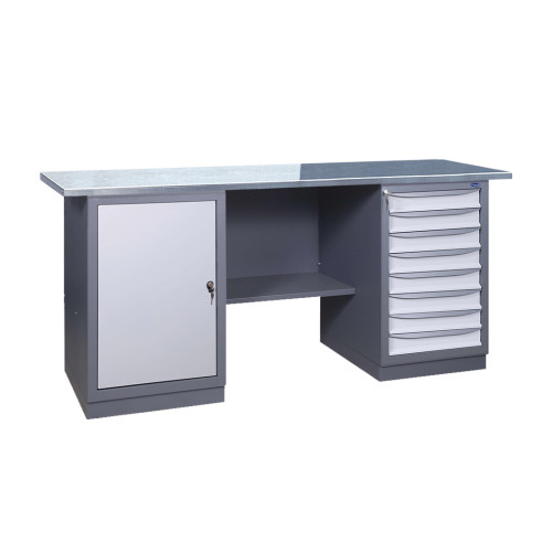 Металевий слюсарний Верстак 41 8М/Д Верстаки з двома тумбами призначені для обладнання робочих місць на промислових підприємствах, в майстернях і автосервісах. Верстаки виготовляються з високоякісної листової сталі. Верстаки двотумбові можуть укомплектовуватися перфорованими панелями, підвісними полками, лампами денного освітлення, блоком розеток, тримачами для інструменту і гачками. Верстаки з двома тумбами можуть поставлятися в розібраному вигляді. Тумби верстаків можуть укомплектовуватися різною кількістю ящиків трьох типорозмірів або дверима. Характерні риси: міцна, надійна конструкція, сучасний дизайн, який не поступається європейським виробникам. Полірозмірно-порошкове фарбування з попереднім фосфатуванням. Стільниця - влагоустойчивая фанера, з різними видами покриттів і чохлів. Комплектуються тумбами з ящиками 3-х типорозмірів. Ящики на телескопічних направляючих. Ящики висуваються на 100% - навантаження на ящик 40 кг. Центральний замок на ящики тумби, індивідуальний замок на дверцята.