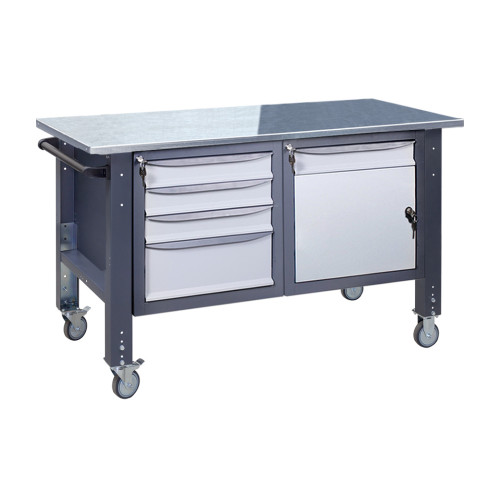 Наявність двох тумб дозволяє максимально ефективно організувати робочий простір. Оцинковані та нержавіючі чохли підвищують стійкість стільниці до механічних пошкоджень, гумове покриття забезпечує краще зчеплення з поверхнею, а фарбований метал витримує значні навантаження.