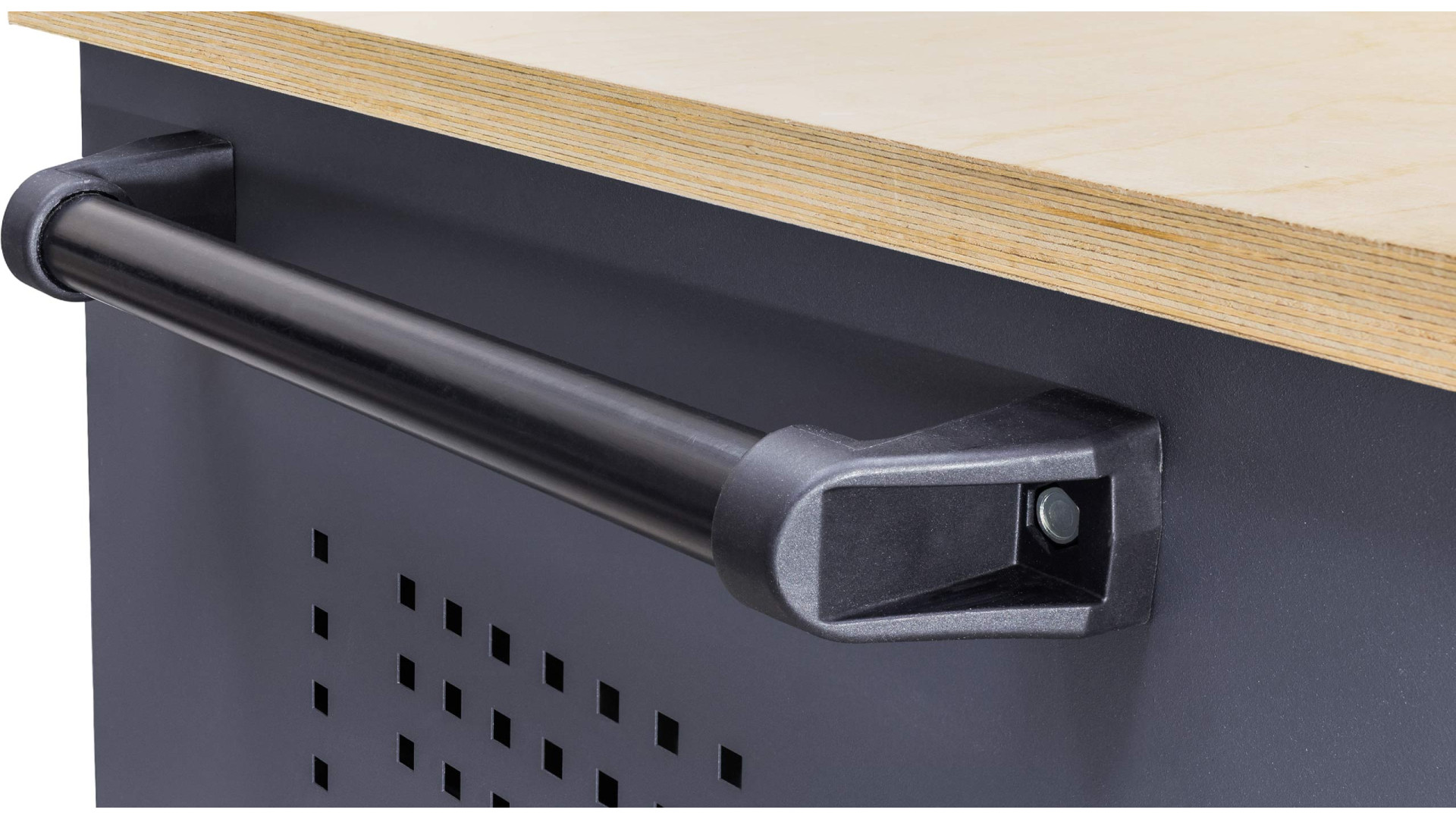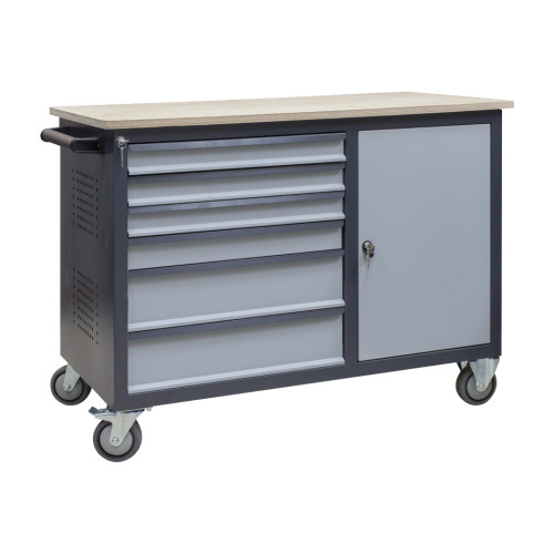Мобільний верстат оснащений місткими ящиками. Сховище розділено на дві секції: одна простора тумба, чотири невеликих і два середніх скриньки. Такий підхід спрощує розміщення різнотипного оснащення, деталей, документів і приладів. Ящики висуваються на телескопічних направних для відкривання на 100%. Вони закриваються надійними замками й витримують навантаження до 40 кг. Це робить верстаки мобільні повноцінним робочим місцем. Додатково УХЛ-МАШ пропонує набір додаткової комплектації. Вона включає захисні чохли для стільниці, перфоровану панель з лампою і набір місткостей. Звертайтеся до менеджера для детальної консультації та замовлення верстата ВМ 4М2С/Д Ф.
