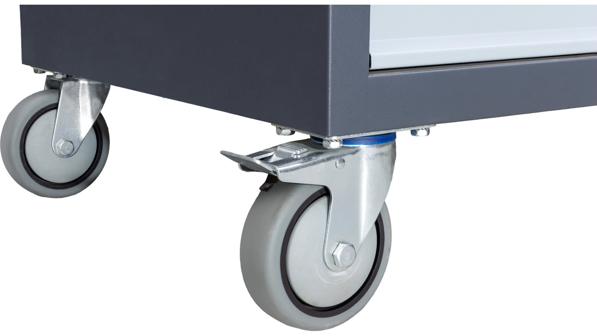 Верстак серії ВМ – це мобільний робочий стіл, який використовується в майстернях, виробничих приміщеннях та ремонтних цехах. Каркас виготовлений зі сталі, яка проходить попередню обробку методом фосфатування, що підвищує зчеплення фарби з поверхнею, та покривається порошковою фарбою для захисту від корозії та механічних пошкоджень. Конструкція оснащена колесами з фіксаторами та ручкою, що дозволяє зручно переміщувати верстак у межах робочої зони та надійно фіксувати його під час роботи. Це рішення підходить для підприємств, які потребують гнучкого робочого місця.