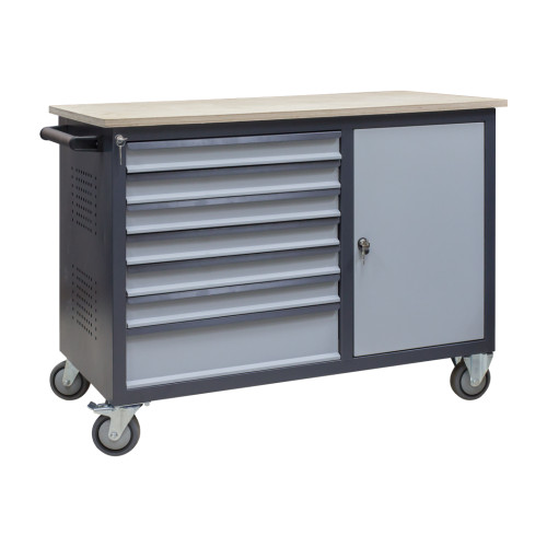 Мобільний верстат ефективний в будь-якій сфері промисловості. Міцна збірка запобігає розхитуванню і витримує щоденну експлуатацію. Верстаку не потрібен ремонт навіть після декількох років, йому не потрібен специфічний догляд. Металевий каркас оснащений шістьма компактними та одним великим ящиком. Вони висуваються на телескопічних направних, забезпечуючи 100% доступу. Для габаритних деталей передбачена тумба з розпашними дверима. Обидва блоки сховищ закриваються замками з поворотним ключем, тому вміст залишиться в цілості. Для замовлення мобільного верстата ВМ 6МС/Д Ф звертайтеся в УХЛ-МАШ. Власне виробництво та авторські розробки для металевих меблів передової якості.