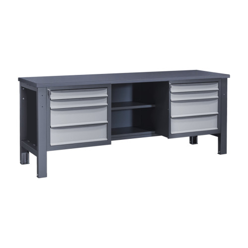 Верстак Важкої серії – це надійний робочий стіл для виконання інтенсивних навантажень у виробничих, ремонтних і слюсарних цехах. Каркас виготовлений із металу, який проходить попередню обробку методом фосфатування, що покращує адгезію фарби, та покривається порошковою фарбою для захисту від корозії та механічних пошкоджень. Конструкція забезпечує високу стійкість під час експлуатації, а дві тумби дозволяють організувати зручне зберігання інструментів і витратних матеріалів.