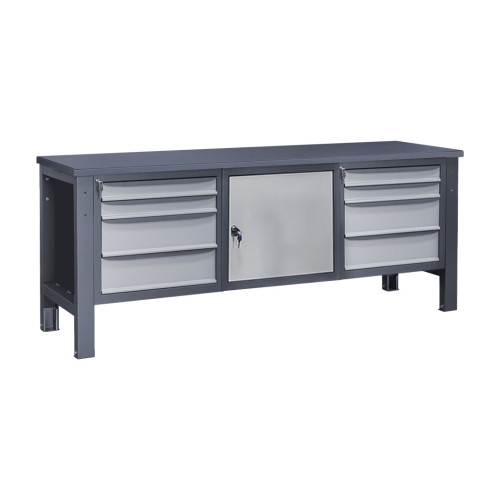 Верстак Важкої серії – це надійний робочий стіл для виконання інтенсивних навантажень у виробничих, ремонтних і слюсарних цехах. Каркас виготовлений із металу, який проходить попередню обробку методом фосфатування, що покращує адгезію фарби, та покривається порошковою фарбою для захисту від корозії та механічних пошкоджень. Конструкція забезпечує високу стійкість під час експлуатації, а дві тумби дозволяють організувати зручне зберігання інструментів і витратних матеріалів.