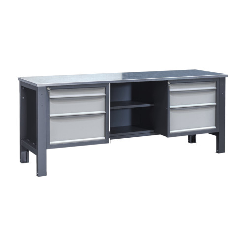 Верстак Важкої серії – це надійний робочий стіл для виконання інтенсивних навантажень у виробничих, ремонтних і слюсарних цехах. Каркас виготовлений із металу, який проходить попередню обробку методом фосфатування, що покращує адгезію фарби, та покривається порошковою фарбою для захисту від корозії та механічних пошкоджень. Конструкція забезпечує високу стійкість під час експлуатації, а дві тумби дозволяють організувати зручне зберігання інструментів і витратних матеріалів.