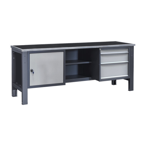 Верстак Важкої серії – це надійний робочий стіл для виконання інтенсивних навантажень у виробничих, ремонтних і слюсарних цехах. Каркас виготовлений із металу, який проходить попередню обробку методом фосфатування, що покращує адгезію фарби, та покривається порошковою фарбою для захисту від корозії та механічних пошкоджень. Конструкція забезпечує високу стійкість під час експлуатації, а дві тумби дозволяють організувати зручне зберігання інструментів і витратних матеріалів.