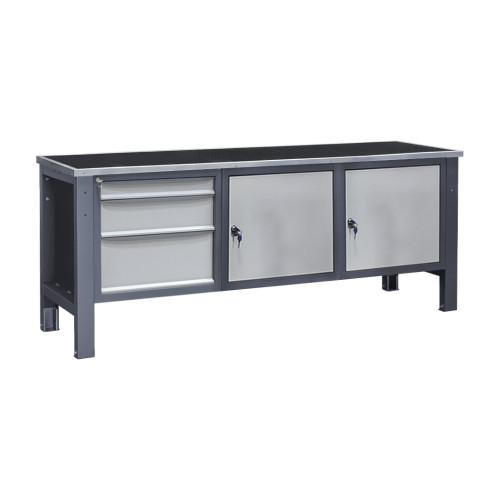 Верстак Важкої серії – це надійний робочий стіл для виконання інтенсивних навантажень у виробничих, ремонтних і слюсарних цехах. Каркас виготовлений із металу, який проходить попередню обробку методом фосфатування, що покращує адгезію фарби, та покривається порошковою фарбою для захисту від корозії та механічних пошкоджень. Конструкція забезпечує високу стійкість під час експлуатації, а дві тумби дозволяють організувати зручне зберігання інструментів і витратних матеріалів.