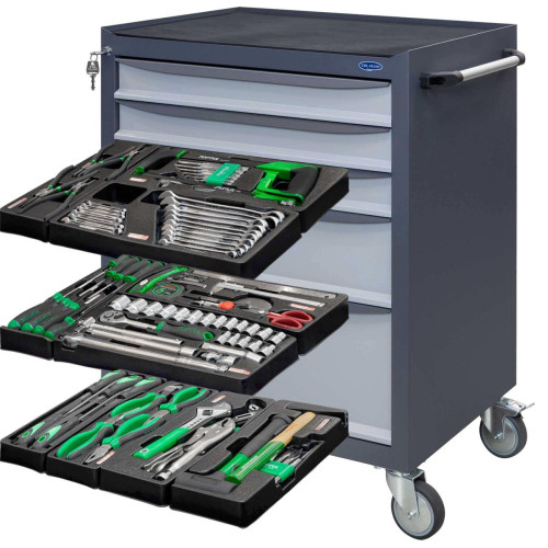 Візки ТУ 3МСБ Слюсар з інструментом 82 одиниці використовуються в автосервісах, промислових компаніях і гаражах. Вони необхідні для зберігання інструментів, деталей, робочої документації та інвентарю. Виріб укомплектований п'ятьма висувними ящиками. Завдяки системі телескопічних направляючих ящики висуваються на 100%, що надає повний доступ до вмісту. Місткість ящиків оптимальна для розміщення комплектів інструменту в ложементах. Наявність центрального замку підвищує захист від стороннього доступу.