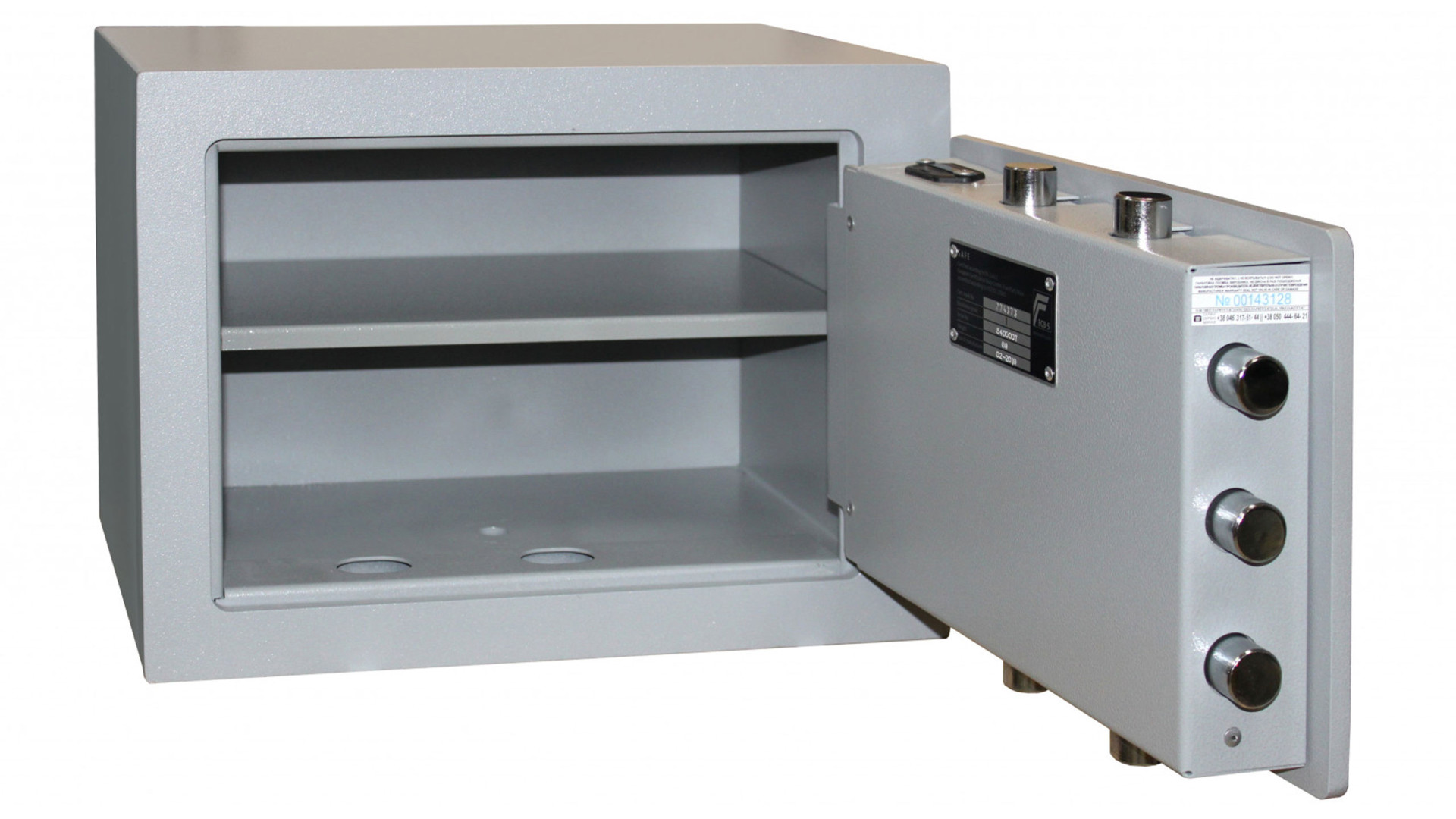 Габарити сейфа становлять 310×435×324 мм, а внутрішній об’єм – 22 літри. Вага конструкції – 69 кг, що робить його стійким до несанкціонованого переміщення. Внутрішнє наповнення передбачає одну полицю, що дозволяє ефективно організувати простір. Колір виконання – сірий (RAL 7040), що робить модель універсальною для різних інтер’єрів. Для стаціонарного встановлення передбачені анкерні вузли для кріплення до підлоги.