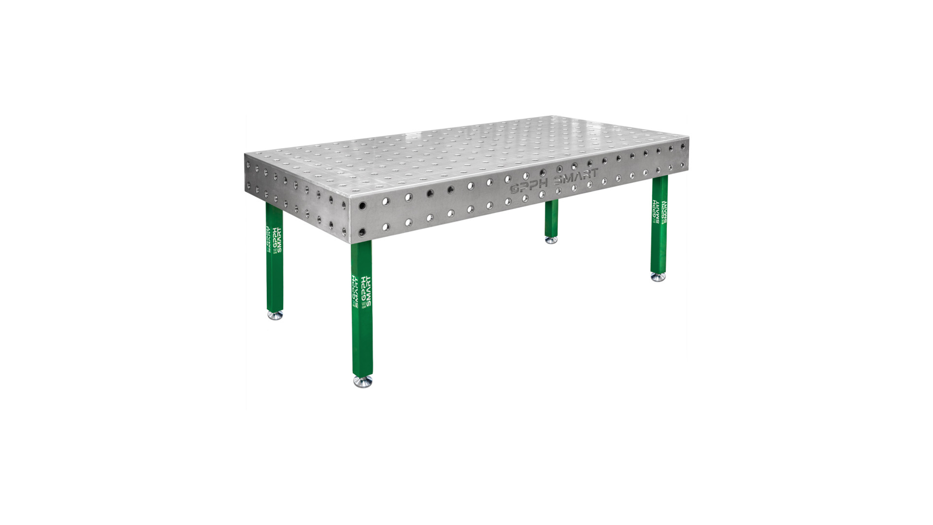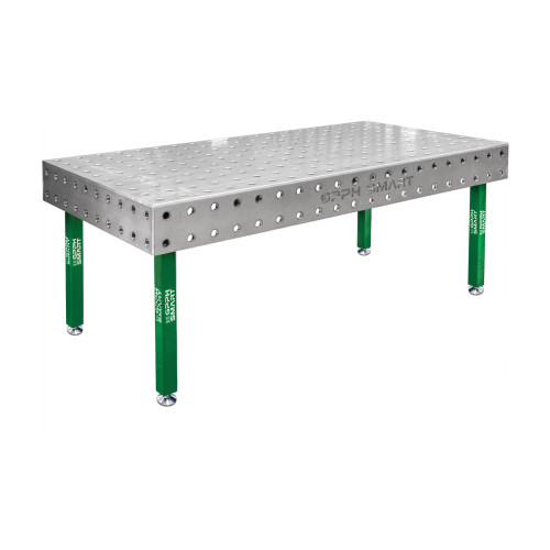 Модель встановлена на металевих регульованих ніжках, які забезпечують стійкість і дають змогу компенсувати нерівності підлоги. Стільниця виготовлена зі сталі, стійкої до високих температур і механічних впливів. Поверхня має точну геометрію, завдяки чому деталі розміщуються рівно та без зміщень. Система отворів Ø28 мм сумісна зі стандартними інструментами для промислового зварювання. Конструкція витримує значне навантаження, забезпечуючи стабільність робочої площини під час експлуатації.